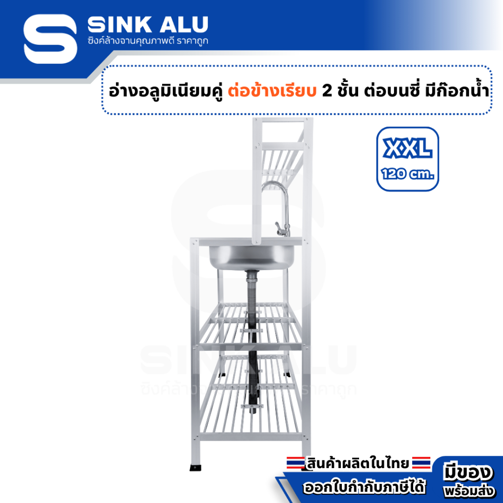 อ่างล้างจาน อลูมิเนียม คู่ต่อข้างเรียบ XXL-120cm. ที่คว่ำจาน 2 ชั้น ต่อบนซี่ มีก๊อกน้ำ อ่าง อ่างล้างมือ ที่ล้างจาน sink