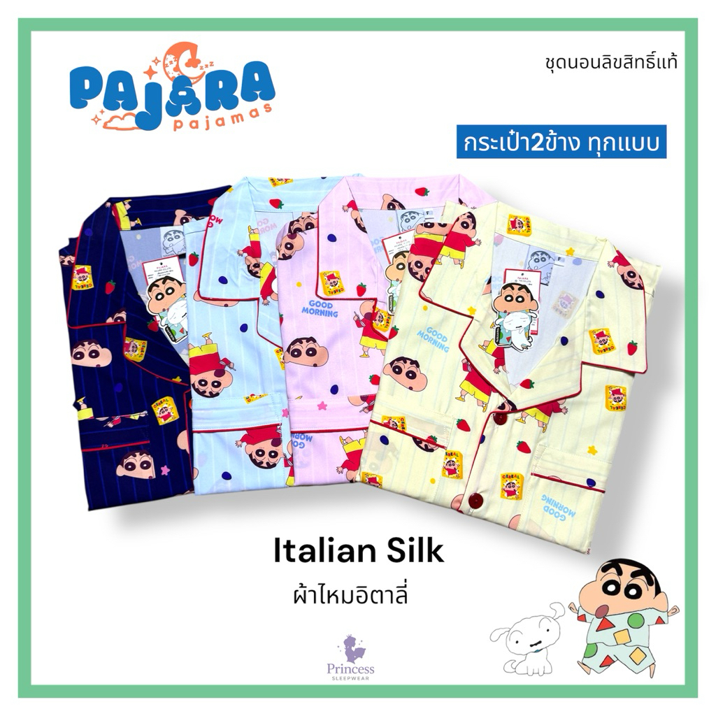 ชุดนอน ชินจัง ผ้าไหมอิตาลี่่้ Shinchan x PAJARA รอบอก 44” /48“ มีกระเป๋า 2 ข้าง ลิขสิทธิ์แท้☁️➿