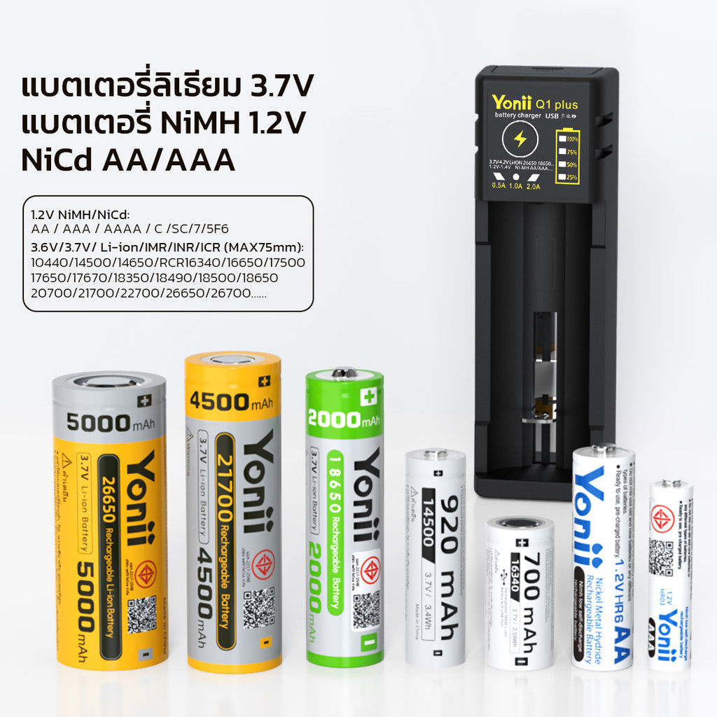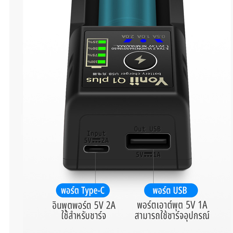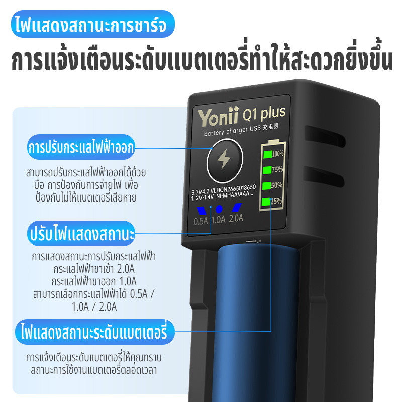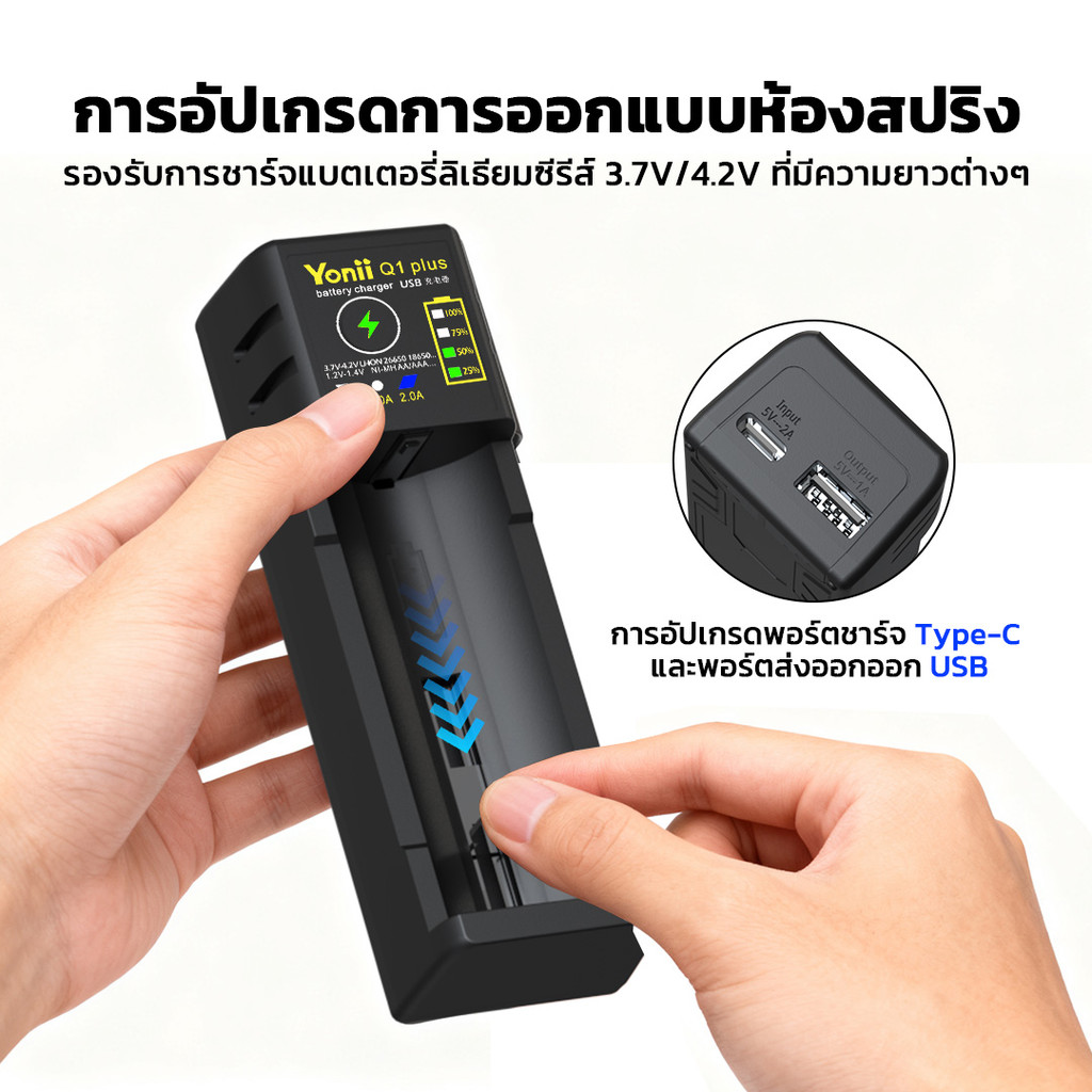 Yonii เครื่องชาร์จถ่าน 3.7V 18650/21700/26650 แบตลิเธียม ชาร์จได้ 1 ก้อน รองรับ รองรับฟังก์ชั่นการจ่ายไฟ 5V 1A Q1 Plus