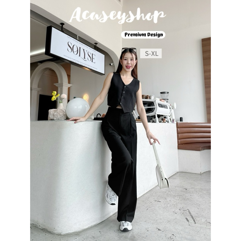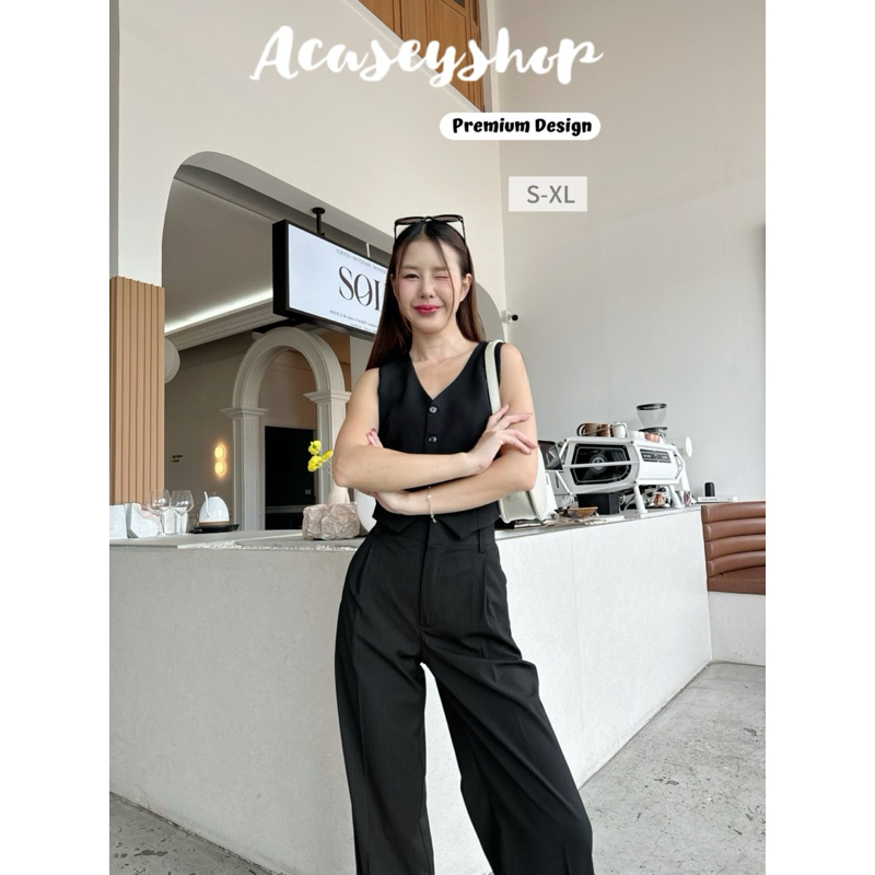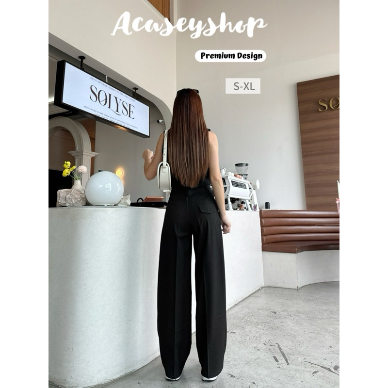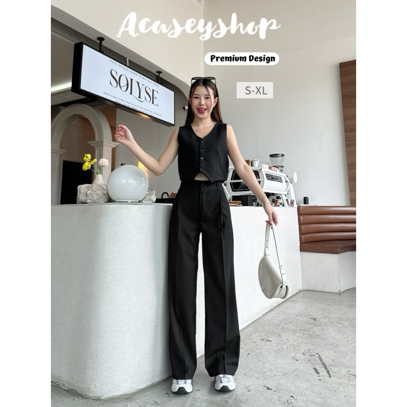 Acasey กางเกงขายาวผู้หญิง เอวสูง ผ้าญี่ปุ่น ขากระบอกใหญ่ แต่งฝากระเป๋าหลัง ซิปหน้า ตะขอหน้า(ลายริ้ว)