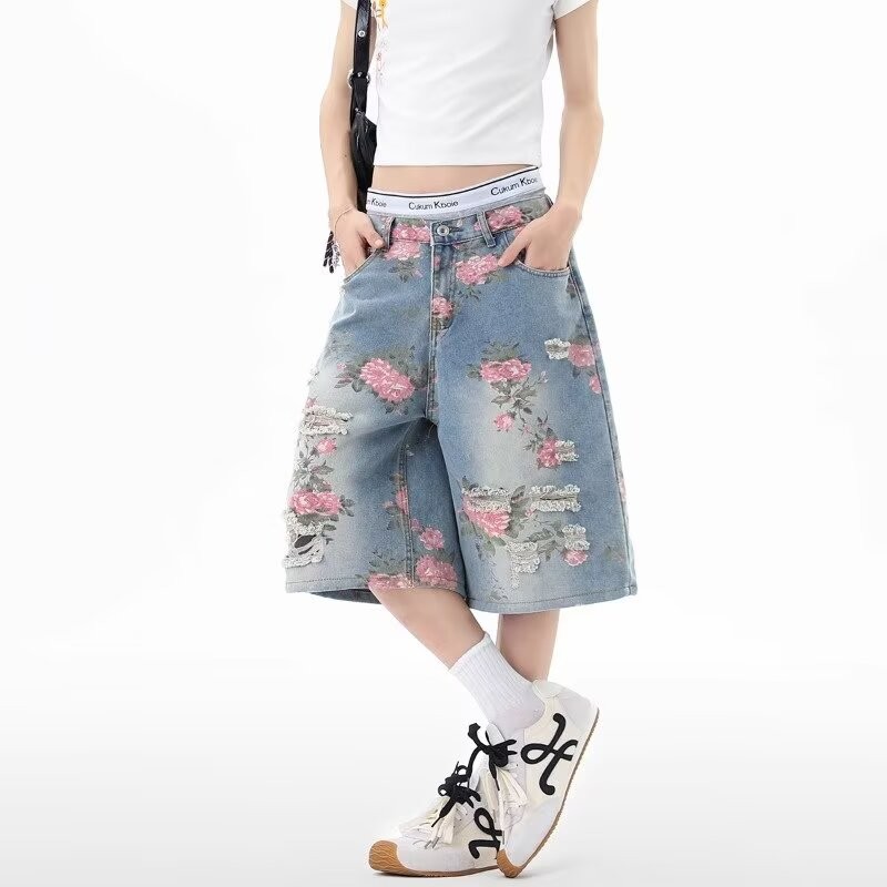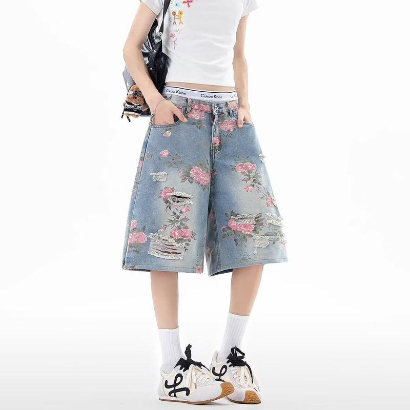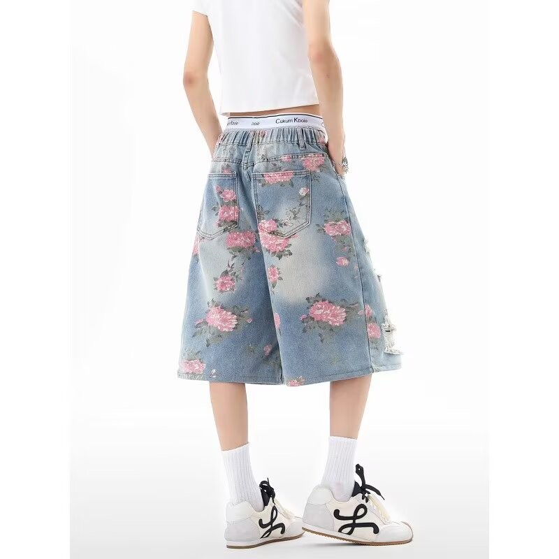 EERSHENSHI กางเกงขาสั้นยีนส์ขาดๆ ลายดอกไม้สำหรับหน้าร้อนสำหรับคู่รัก สไตล์เกาหลี