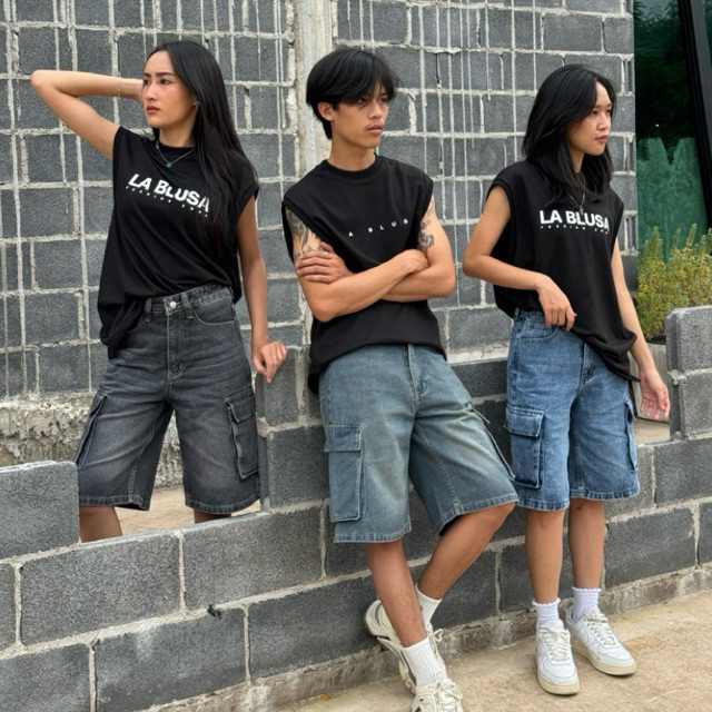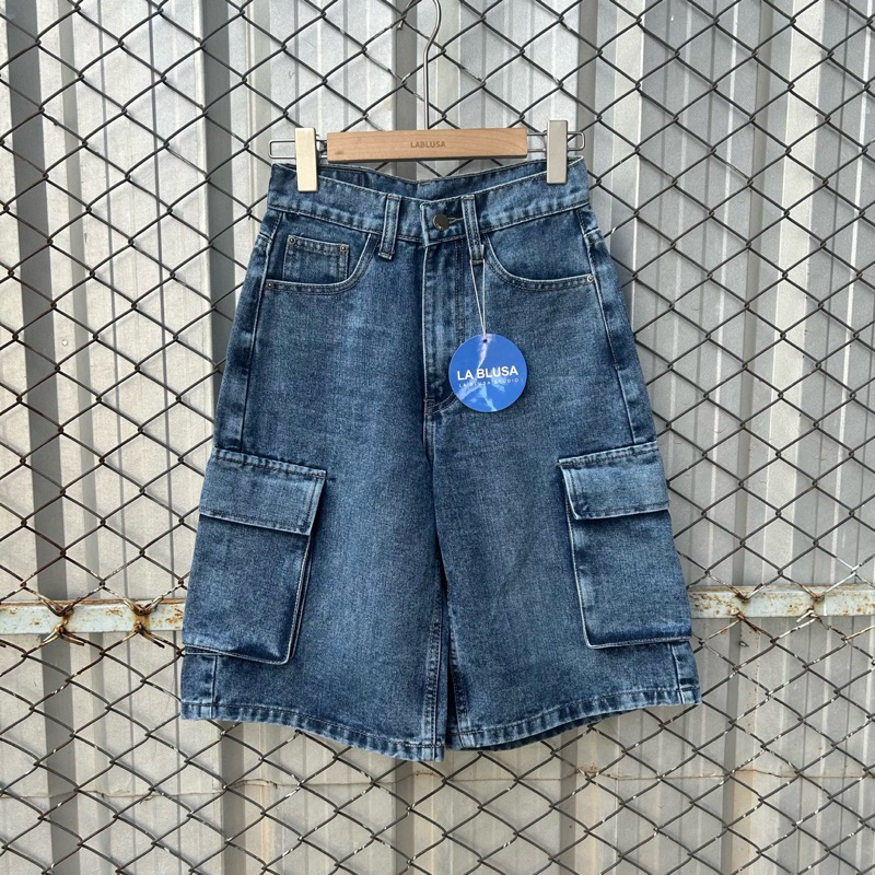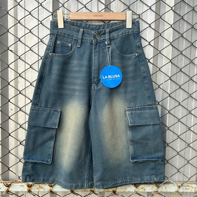 LABLUSA - LBS257 กางเกงขา4ส่วน เเต่งกระเป๋าคาร์โก้ ความยาวคลุมเข่า (Unisex)