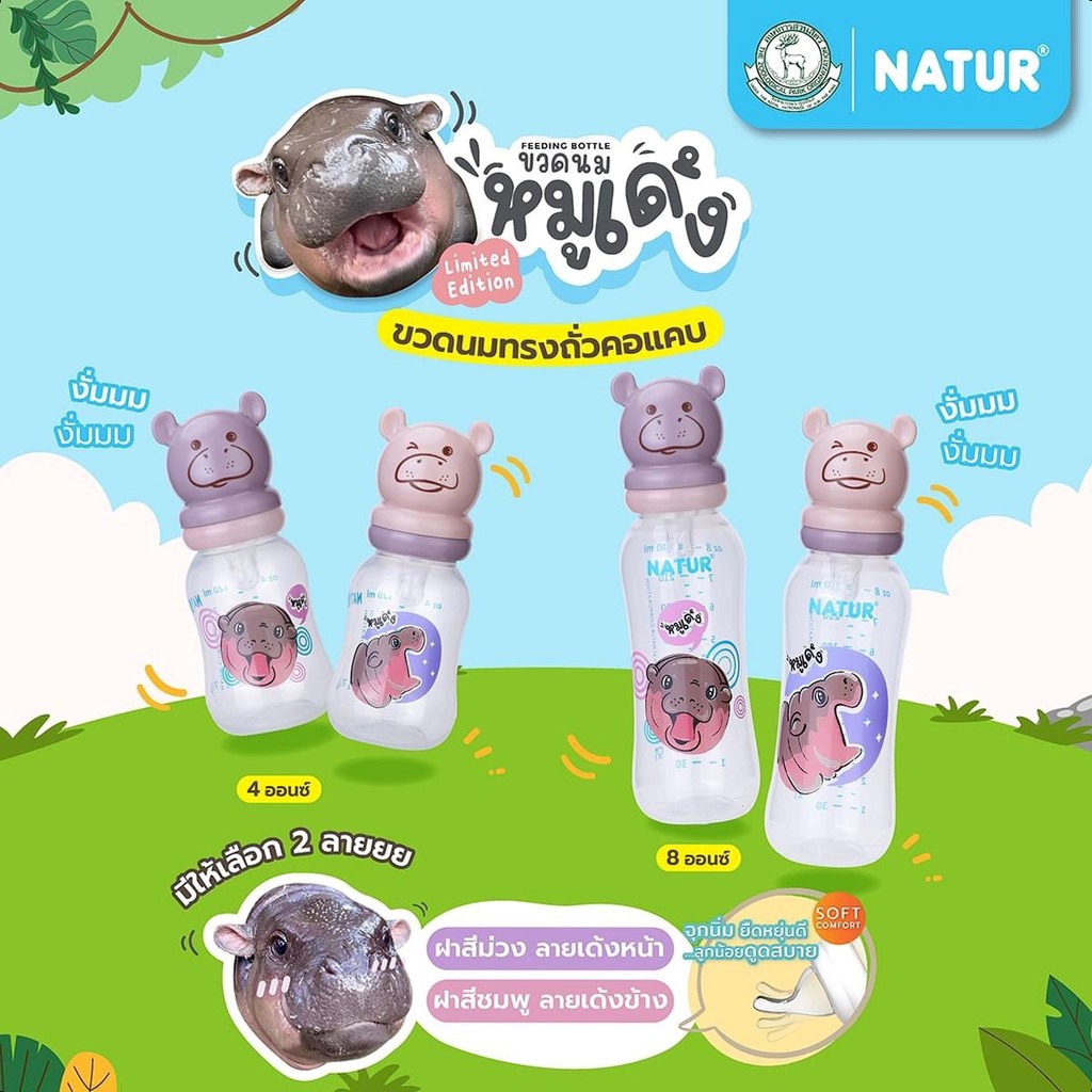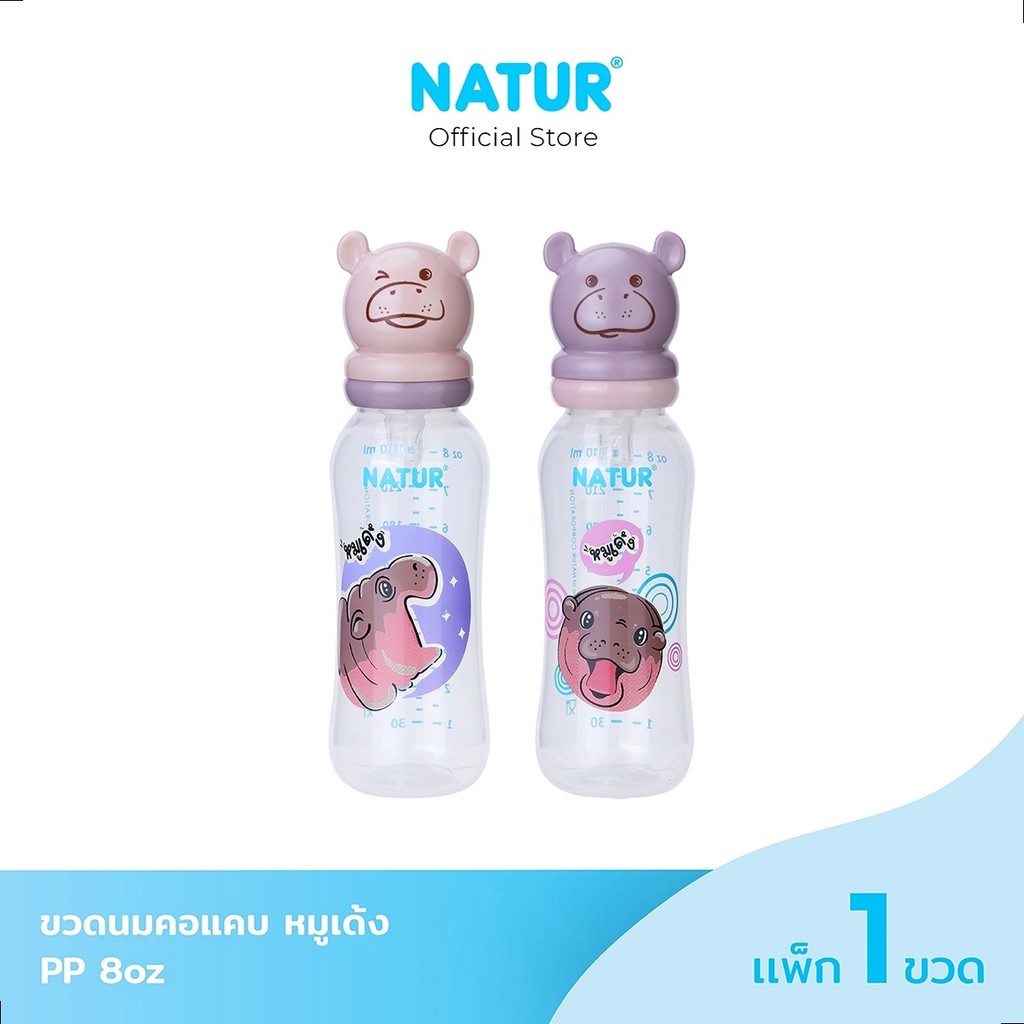 NATUR เนเจอร์ X หมูเด้ง ขวดนม ขวดนมเด็ก ขวดนมคอแคบ ฝาหมูเด้ง 4oz/8oz (ชริ้งฟิล์ม 1 ขวด)