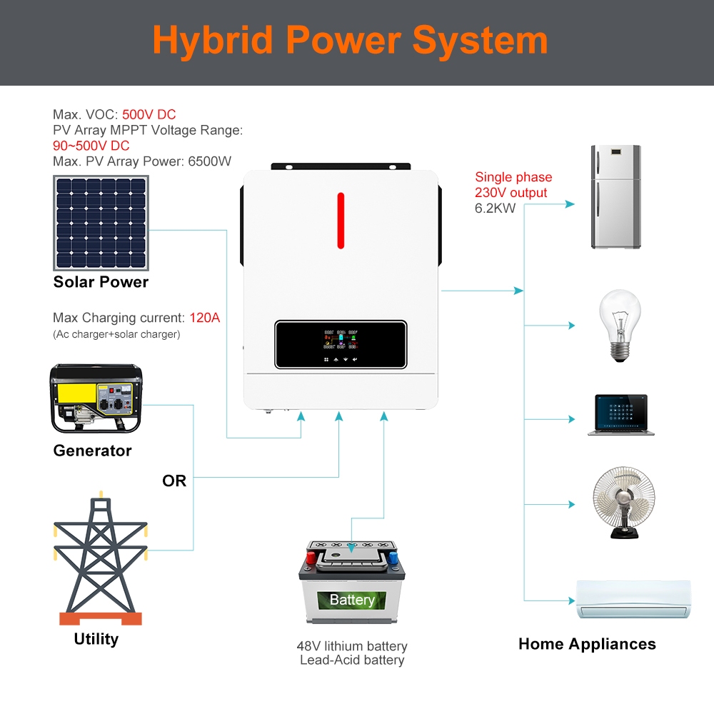6.2KW MPPT อินเวอร์เตอร์ไฮบริดแบบ On-grid ในตัว 120A ตัวควบคุมการชาร์จพลังงานแสงอาทิตย์ 50/60Hz Auto 230Vac Pure Sine Wave อินเวอร์เตอร์พลังงานแสงอาทิตย์รองรับแบตเตอรี่ 48V
