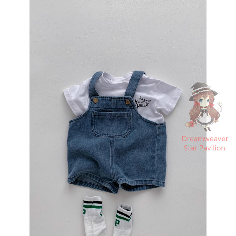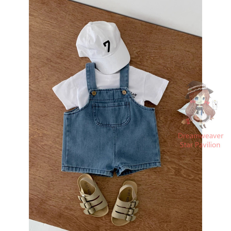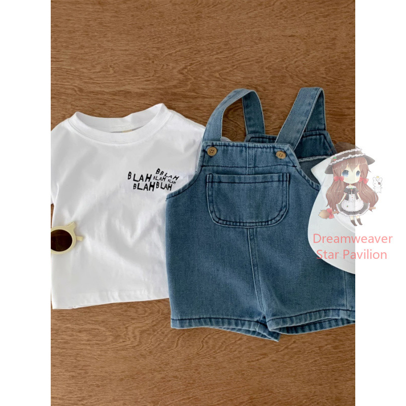 ชุดเอี๊ยมเสื้อยืดแขนสั้น สีขาว และกางเกงยีน ทรงหลวม แฟชั่นฤดูร้อน สําหรับเด็กทารกแรกเกิดผู้ชาย และเด็กผู้หญิง