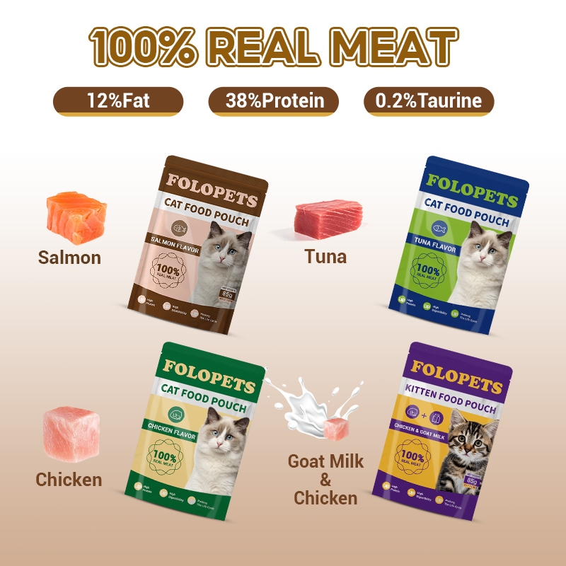 Folopets อาหารแมวเปียก 85g ถุงอินทรีย์ธรรมชาติสดอาหารแมวอาหารเปียกอาหารแมวสําหรับขนมปังทั้งหมดแมว 4 รสชาติ