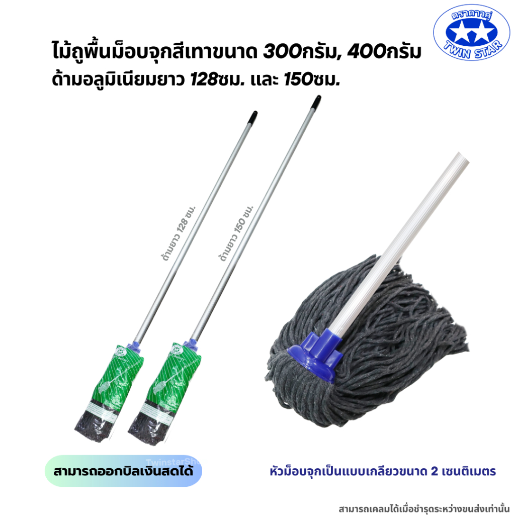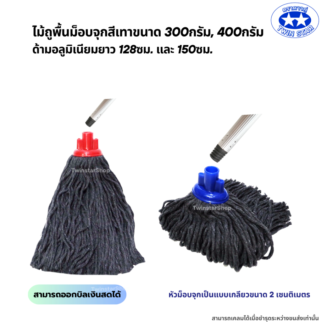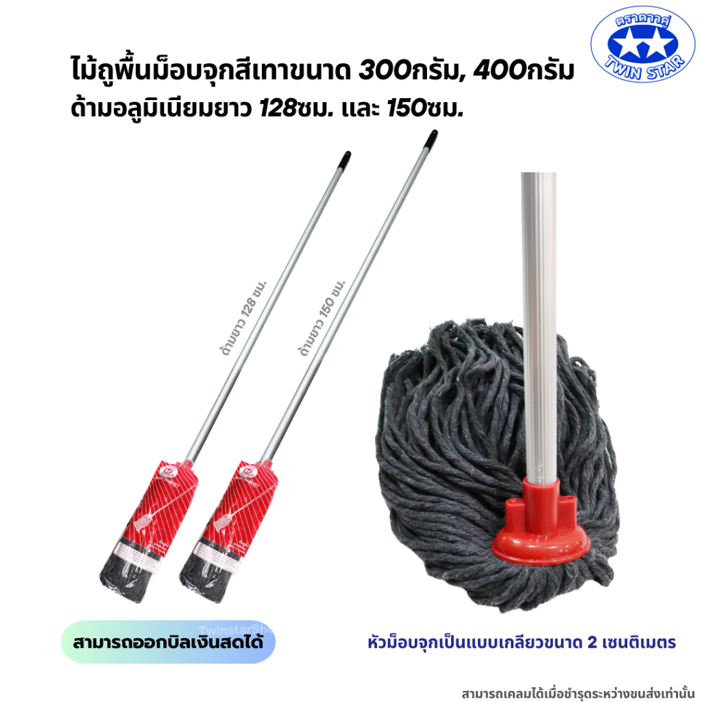ไม้ถูพื้นม็อบจุกสีเทา (ด้ามอลูมิเนียมไม่เป็นสนิมและหนาแข็งแรง128,150ซม.) มี 2 ขนาด 300g,400g