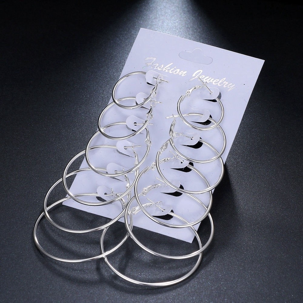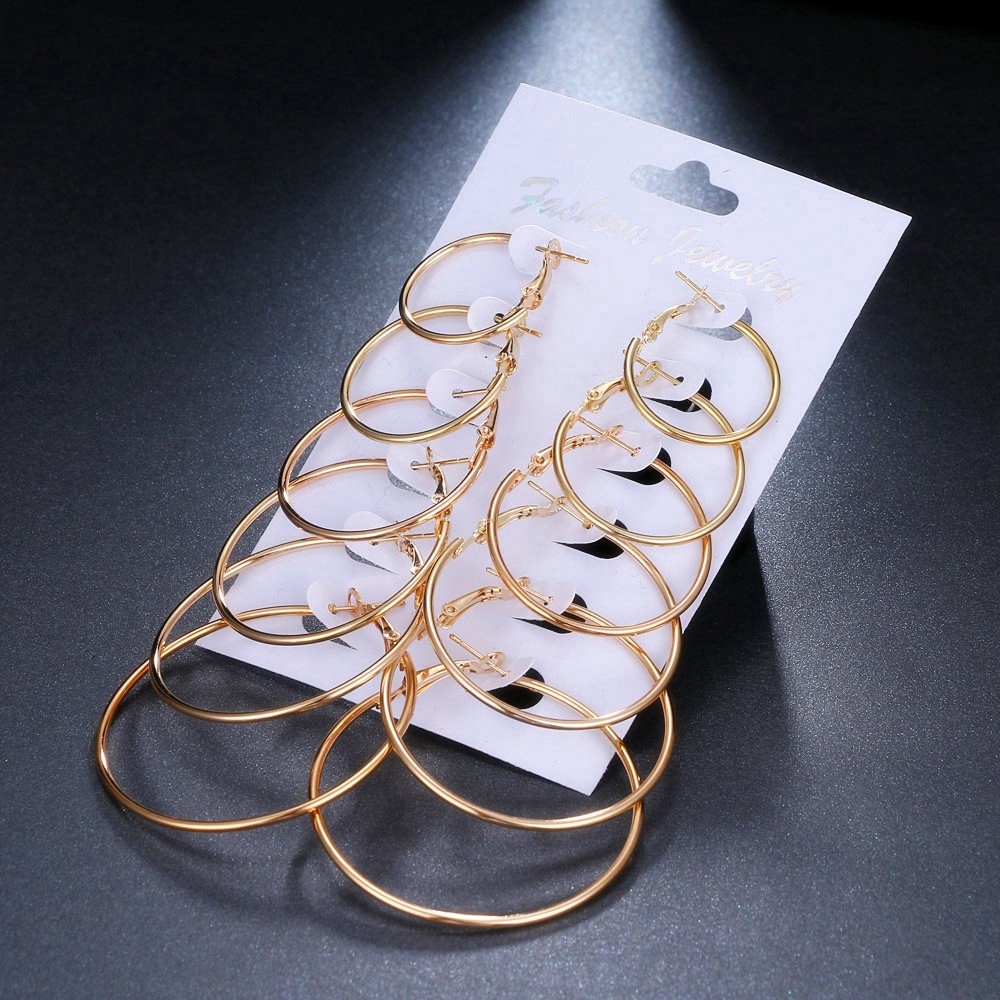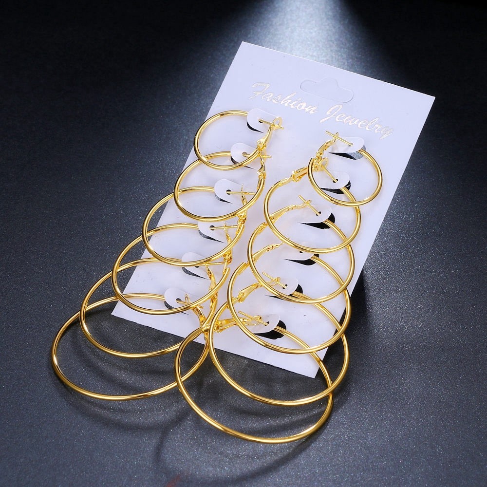ชุดต่างหู ห่วงวงกลม หลายขนาด สีทอง/สีเงิน 6 คู่/ชุด