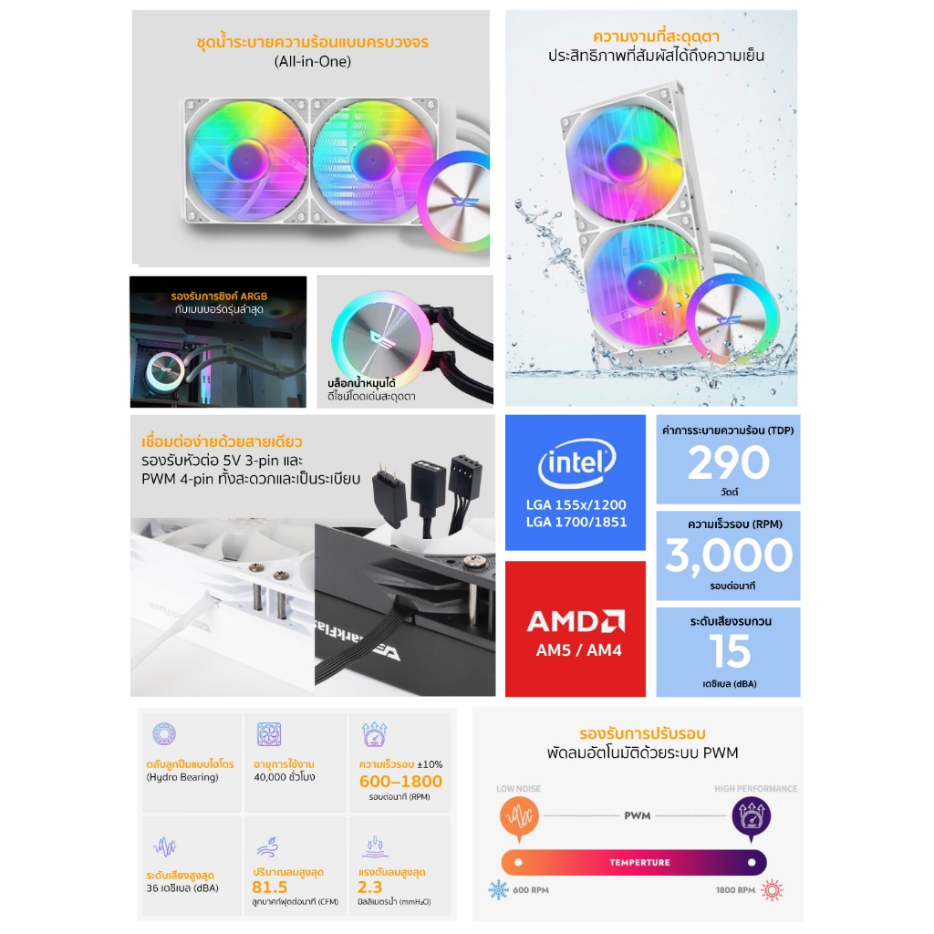 ชุดน้ำระบบปิด DarkFlash DG240 (TDP 290W) 240mm ARGB Liquid Cooler รับประกัน 2 ปี