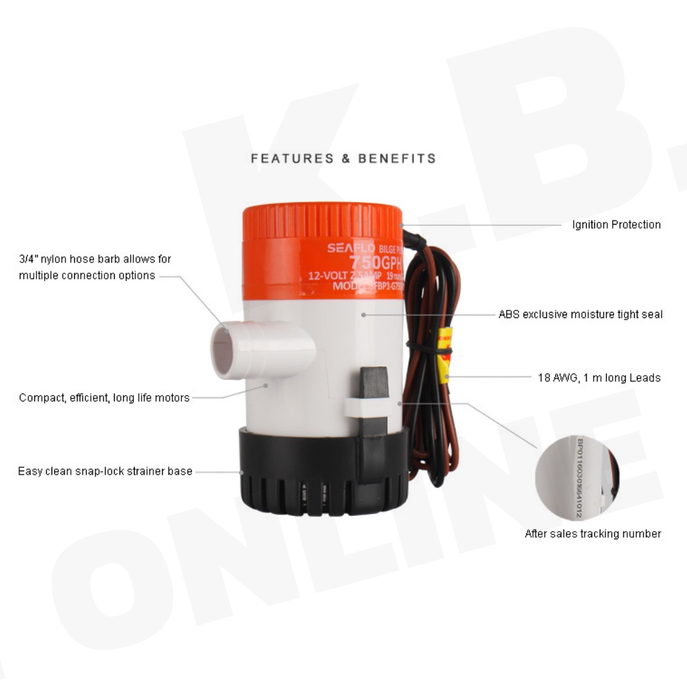 ปั๊มใต้ท้องเรือ SEAFLO ซีรี่ย์ 01 750GPH 12V Bilge Pump 750GPH 12V, SEAFLO 01 Series รุ่น SFBP1-G750-01