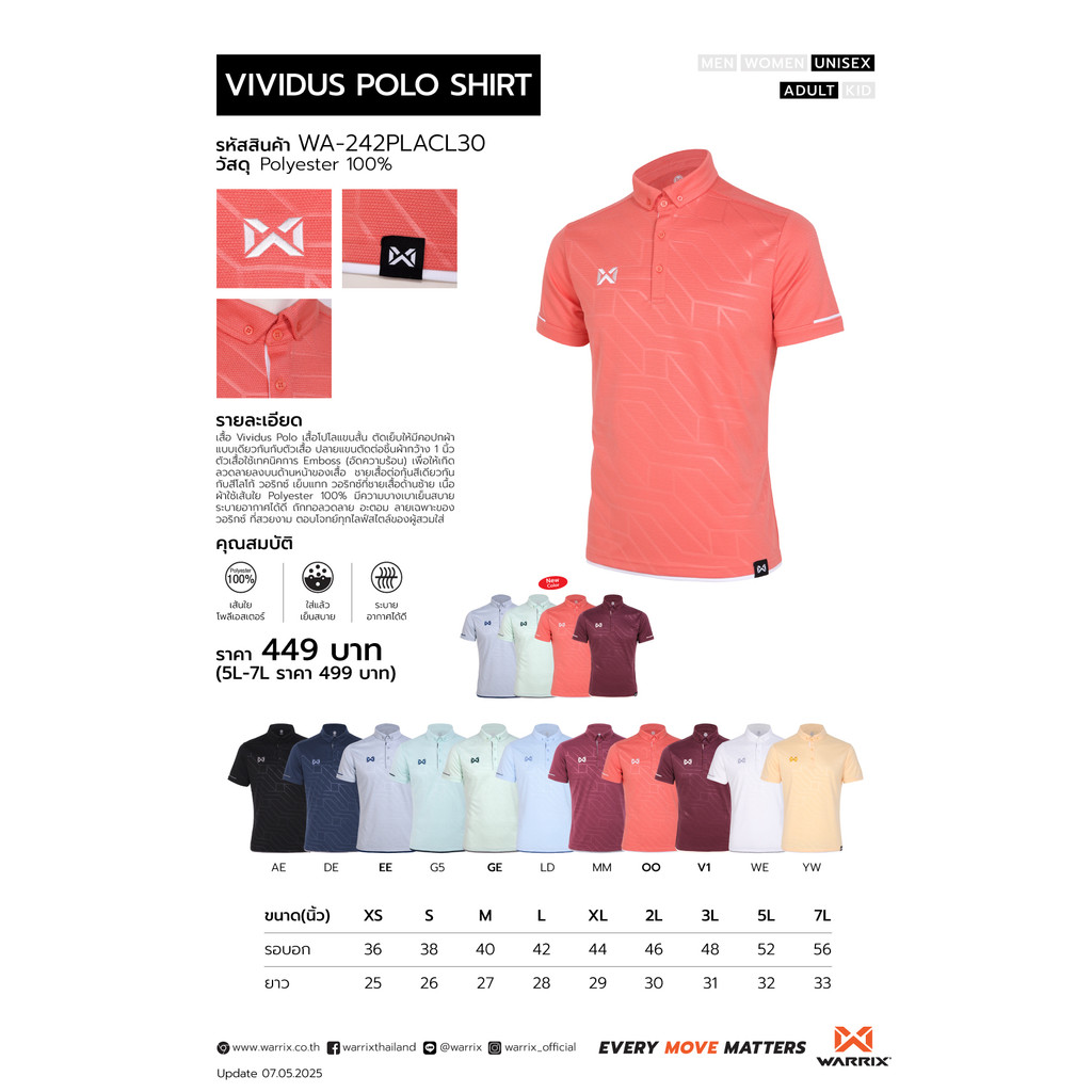 เสื้อ WARRIX รุ่น VIVIDUS รหัส WA-242PLACL30 วาริกซ์ เสื้อโปโล WARRIX ชายและหญิง ของแท้100%