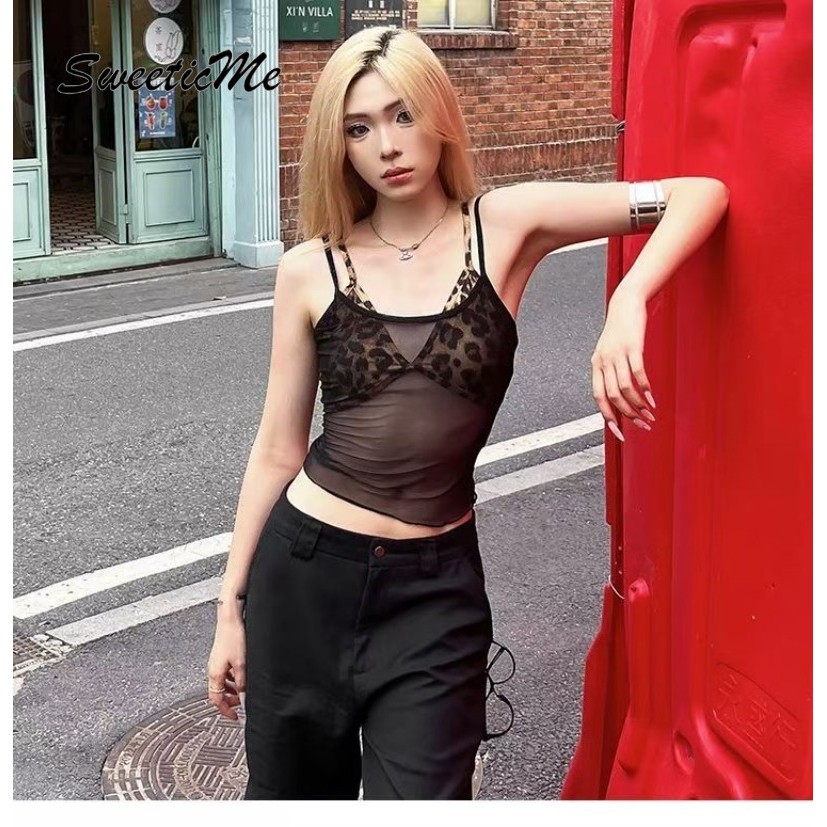 SweeticMe แฟชั่นผู้หญิงใหม่เซ็กซี่ตาข่ายดูผ่านเสือดาวสองชิ้นชุดสายรัด Camisole