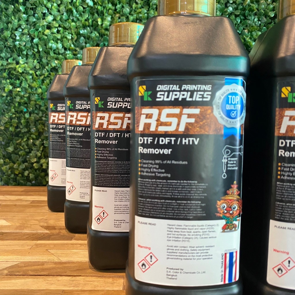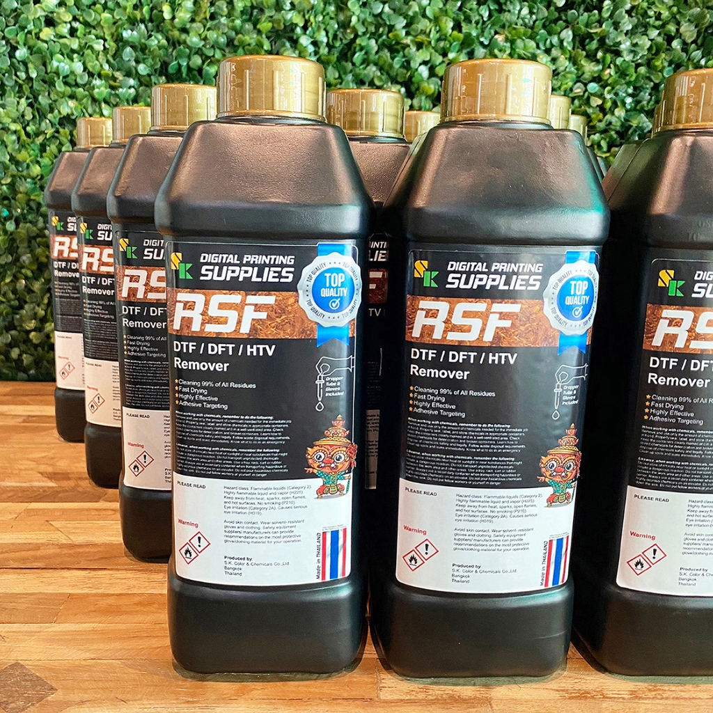 น้ำยาลอกDTF/DFT/HTV 1,000ml SK RSF (ละลายกาวไม่ละลายสี) Remover น้ำยาลอกเฟล็กซ์ ฮีตทรานสเฟอร์ไวนิล{แถมถุงมือ+หลอดดูดสาร}