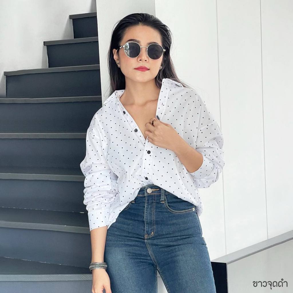 Takayay Brand เสื้อเชิ๊ต ผ้าคอตตอน สีขาวจุดดำ 36-54 นิ้ว เสื้อเชิ้ตลายจุด เสื้อเชิ้ตสีขาว