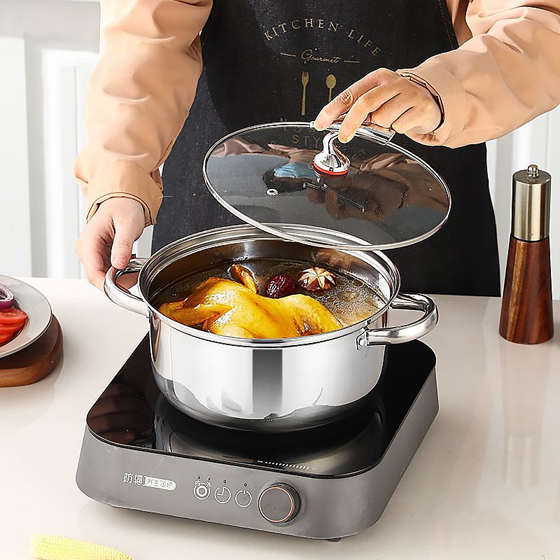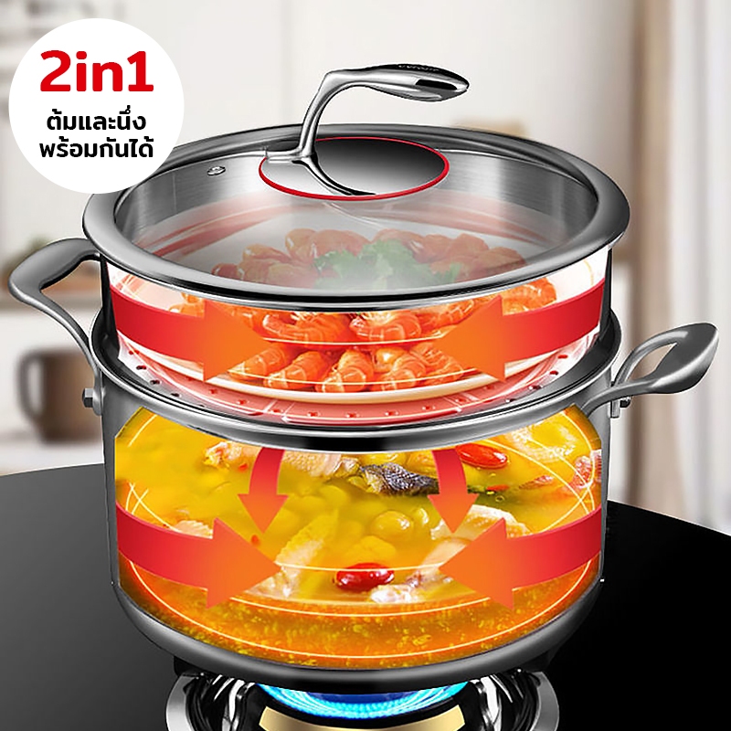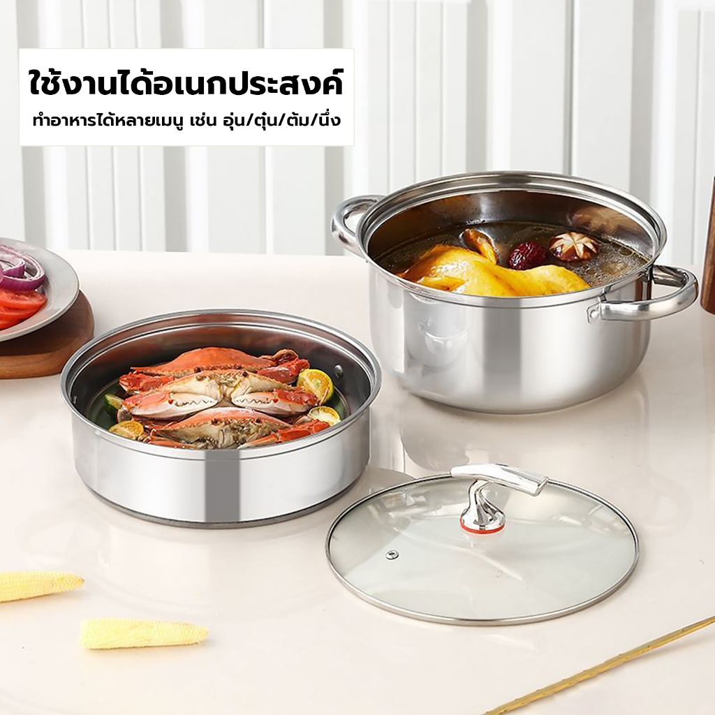 หม้อนึ่งสแตนเลส 2 ชั้น SUS304 พร้อมฝาใส หม้อซึ้งสแตนเลส ใช้กับเตาแม่เหล็กไฟฟ้าได้ ขนาด24CM