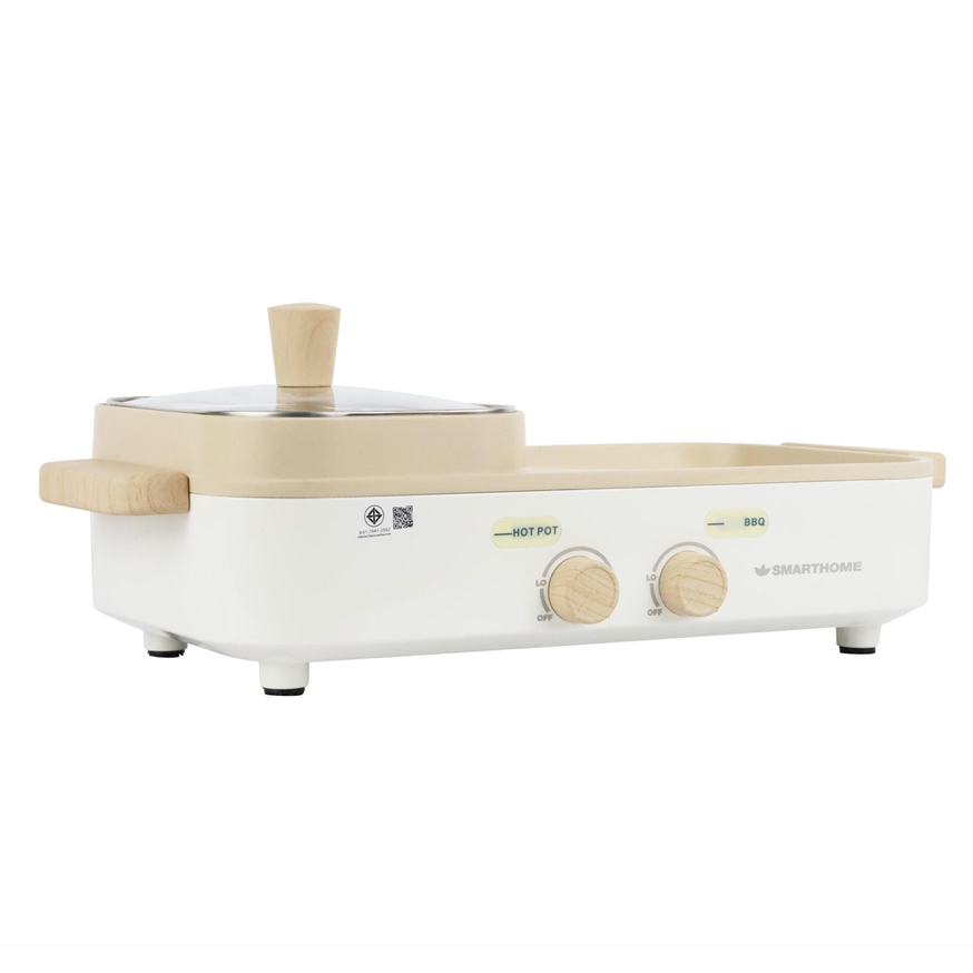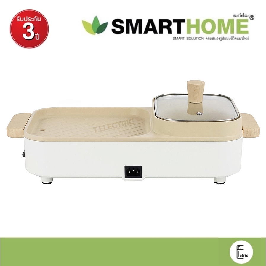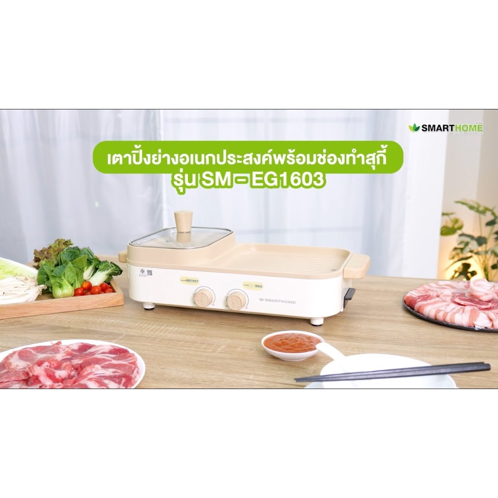 SMARTHOME เตาปิ้งย่างบาร์บีคิว SM-EG1603 สีครีม รุ่นใหม่ กำลังไฟ 1600w (รับประกัน 3 ปี) เตาย่างทรงเหลี่ยม หม้อสุกี้ชาบู