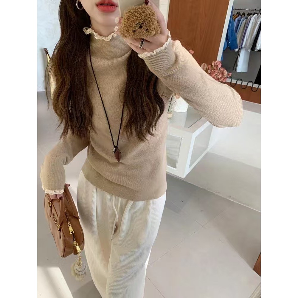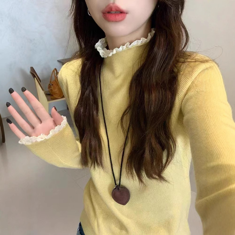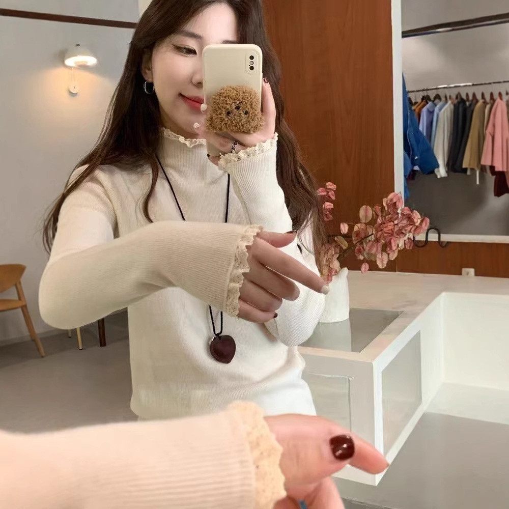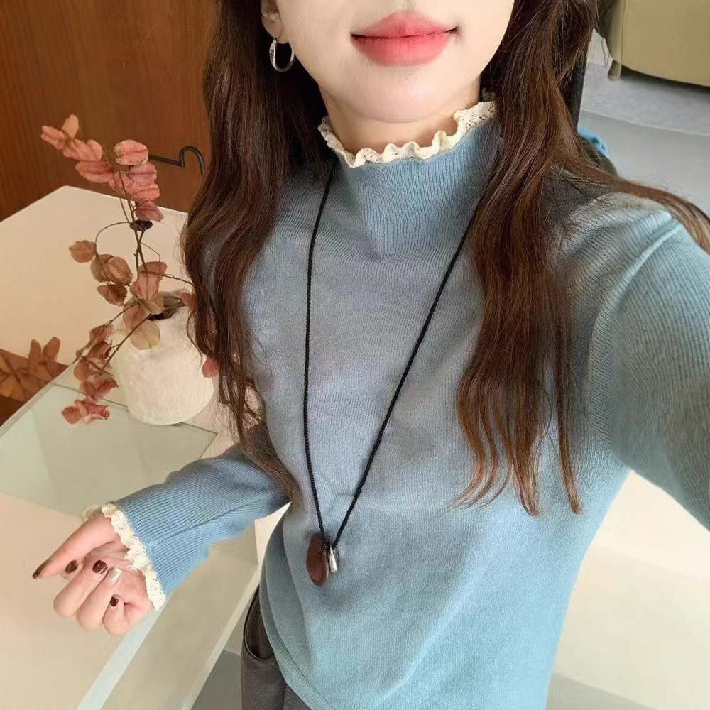 ครึ่งคอเต่าลูกไม้ขอบเสื้อกันหนาวผู้หญิงสไตล์ใหม่ด้านในบางพอดี ผอมลง ดู
