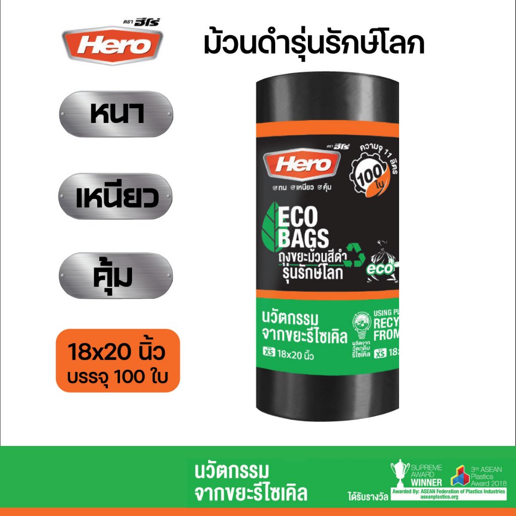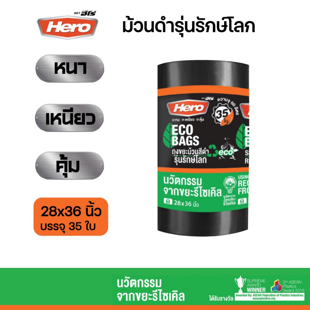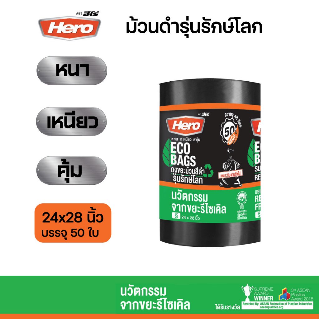 ถุงขยะสีดำฮีโร่ Hero รักษ์โลก ECO BAGS หนา เหนียว ทนต่อการฉีกขาด แบบม้วน คุ้มค่า มีหลายขนาดให้เลือก