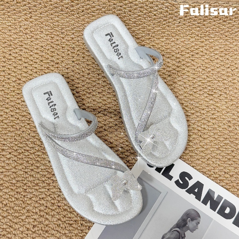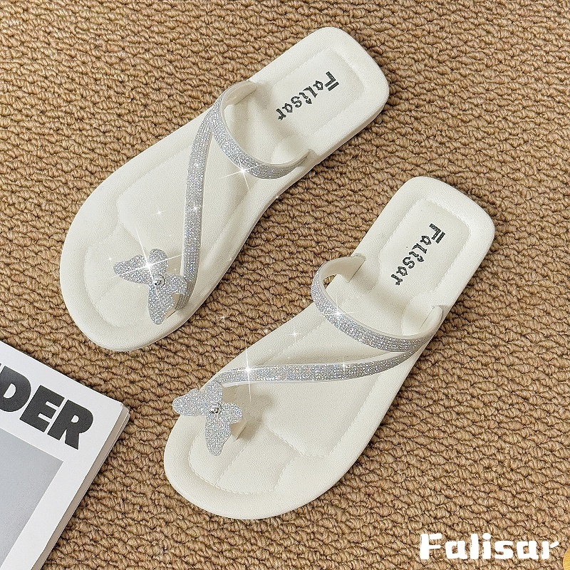 Falisar รองเท้าแตะผู้หญิง แฟชั่น รองเท้าแตะพื้นเตี้ยสายเพรชไขว้แต่งอะไหล่ผีเสื้อ 6626-1