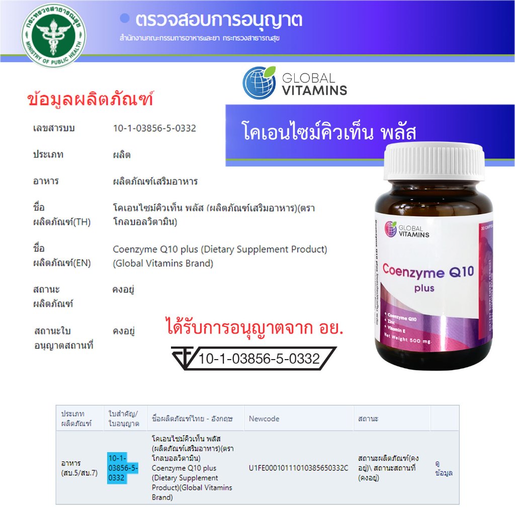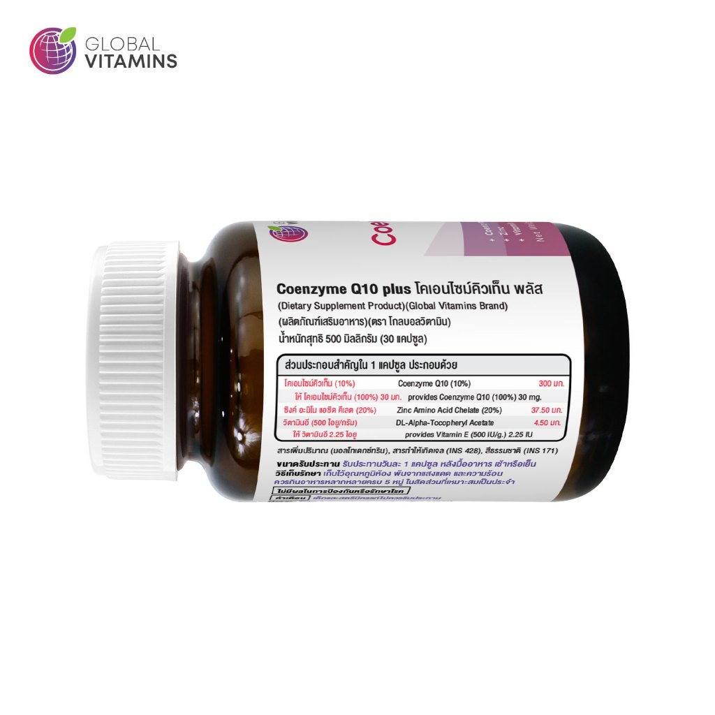 Q10 x 1 ขวด โคเอนไซม์คิวเท็น พลัส โกลบอลวิตามิน Coenzyme Q10 Global Vitamins ซิงค์ Zinc วิตามินอี Vitamin E