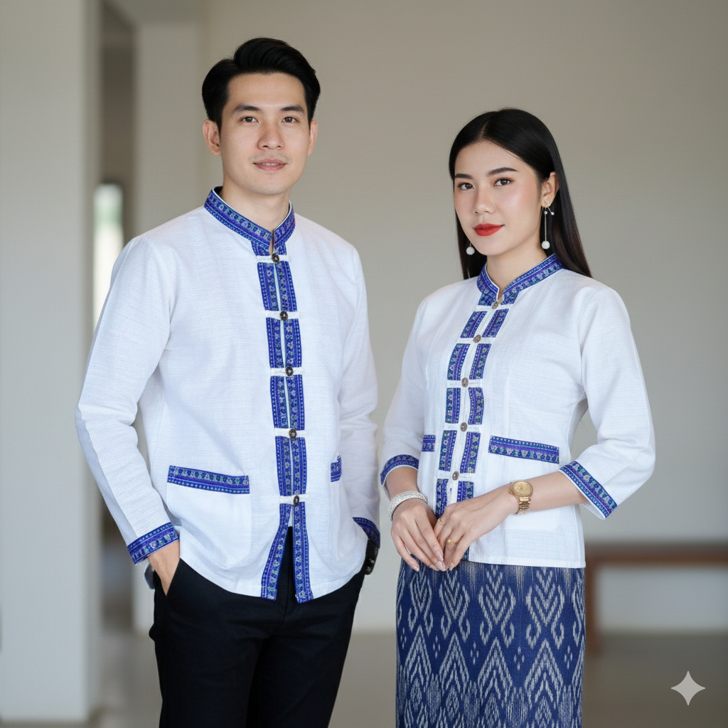 เสื้อพื้นเมืองคู่ แต่งเทปภูไทแขนยาว ผ้าฝ้ายเกรดA เนื้อนุ่มใส่สบาย