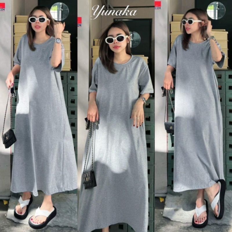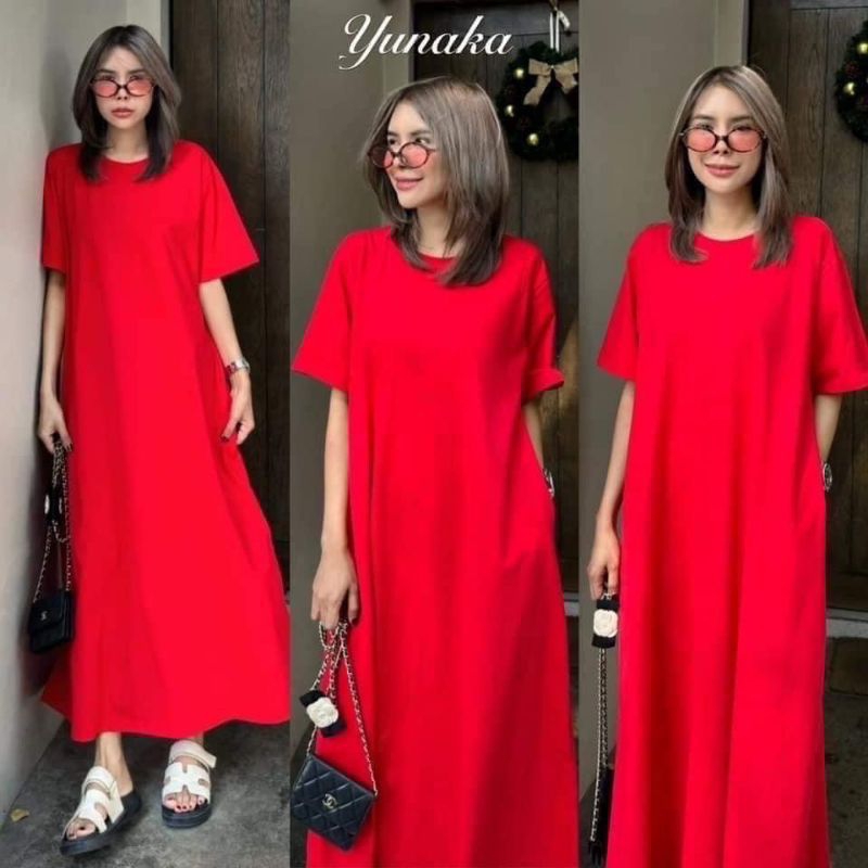 เดรสคอกลมแขนสั้น ทรงปล่อยแบบ oversize style เจาะกระเป๋าข้าง 2 ข้าง เพิ่มดีเทลผ่าข้าง