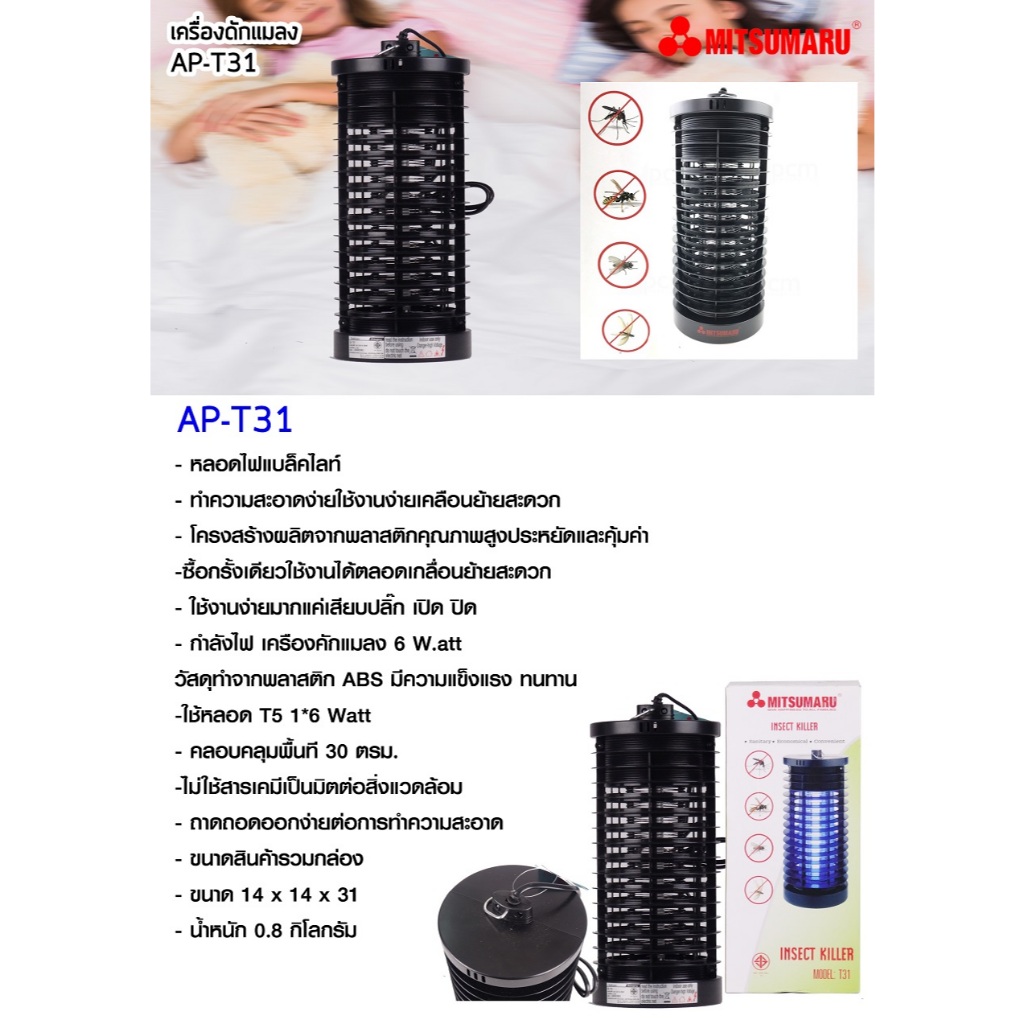 Mitsumaru เครื่องดักยุงและแมลงกลางแจ้งและในบ้าน รุ่น AP-T31 สีดำ คลอบคลุมพื้นที่ 30 ตร.ม. / รับประกัน 1 ปี