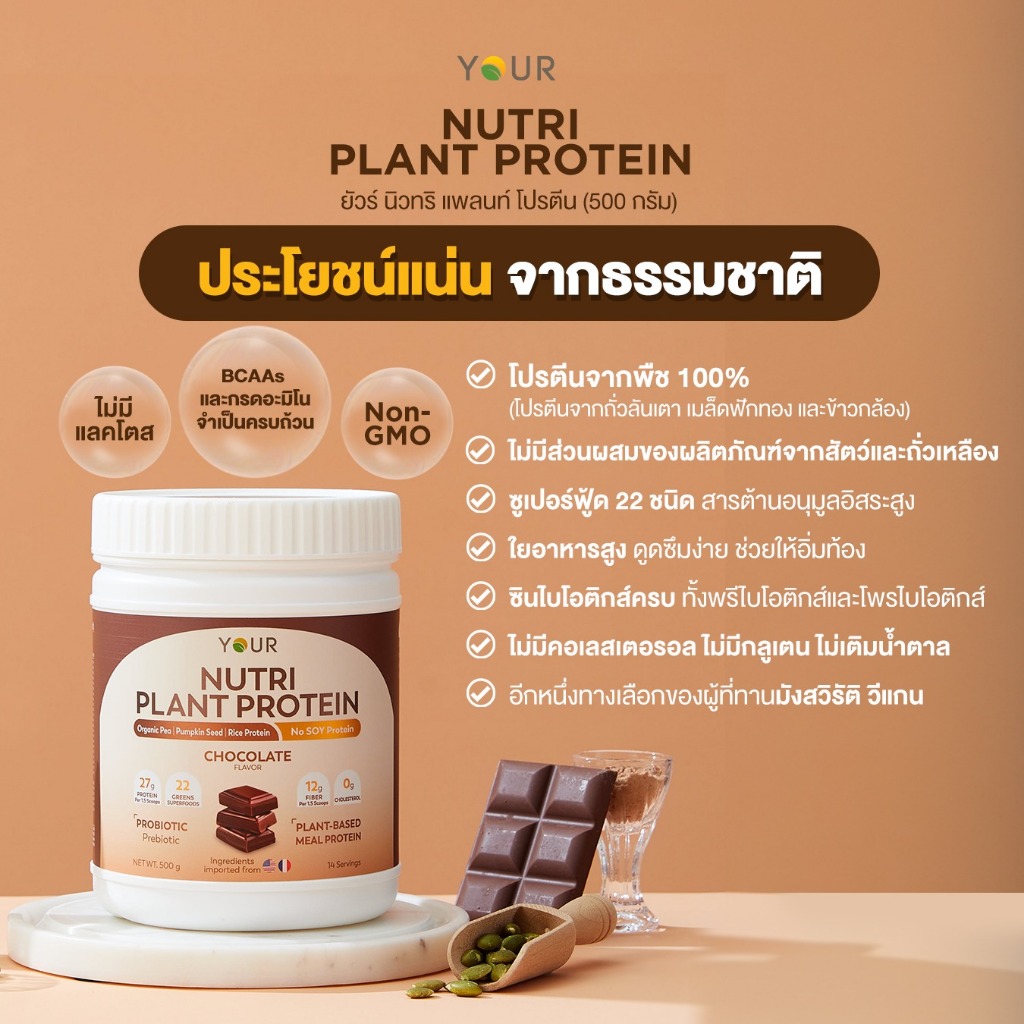 YOUR (ยัวร์) นิวทริ แพลนท์ โปรตีนจากพืช 100%+Superfood 22 ชนิด รสช็อกโกแลต 500 g. 1 กระปุก ส่งฟรี - 045000201