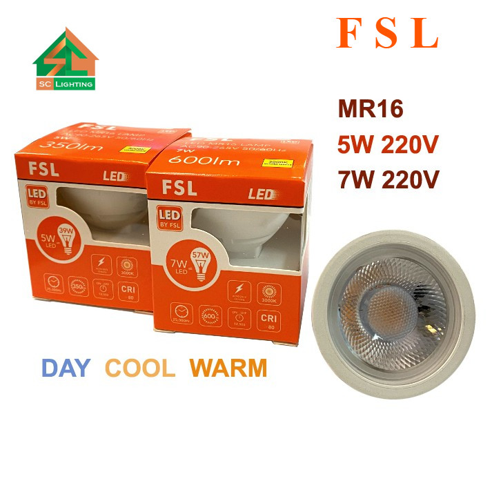 FSL หลอด LED MR16 220V (ไฟตรง) 5W และ 7W มี 3 แสง ขาว คลู และวอร์ม