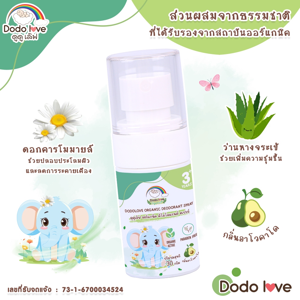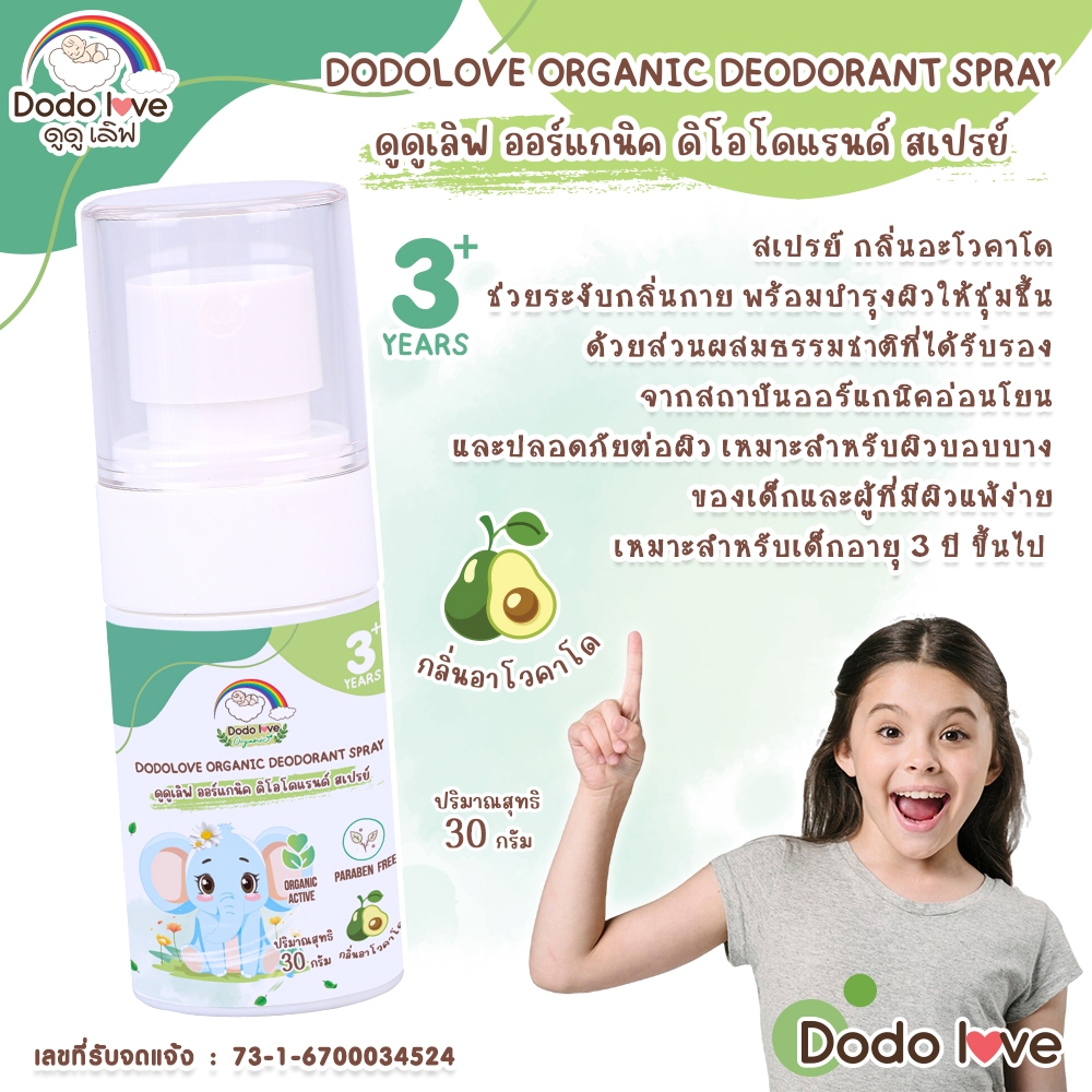 DODOLOVE Organic สเปรย์ สเปรย์ระงับกลิ่นกาย สำหรับเด็ก กลิ่นอาโวคาโด สูตรออแกนิค ขนาด 30 กรัม
