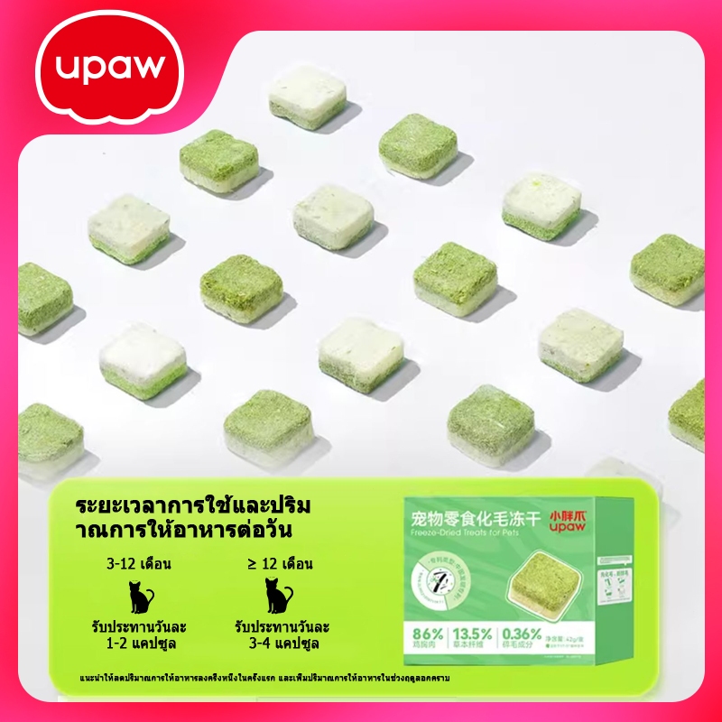 Upaw ขนมแมว หญ้าแมวฟรีซดราย ขนมแมวฟรีซดราย อกไก่ผสมต้นอ่อนข้าวสาลีฟรีซดราย ช่วยขับขนในลำคอ โปรตีนสูง 58%