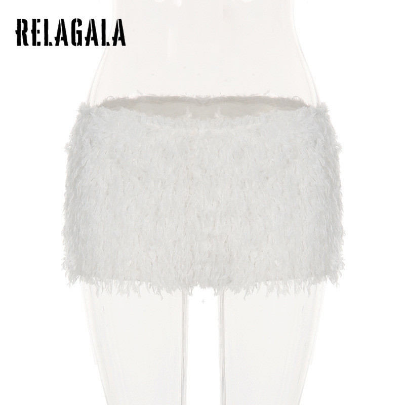 RELAGALA ผู้หญิงแฟชั่นใหม่คริสต์มาสสีทึบ Furry เอวสูง Slim Fit กระโปรงมินิ