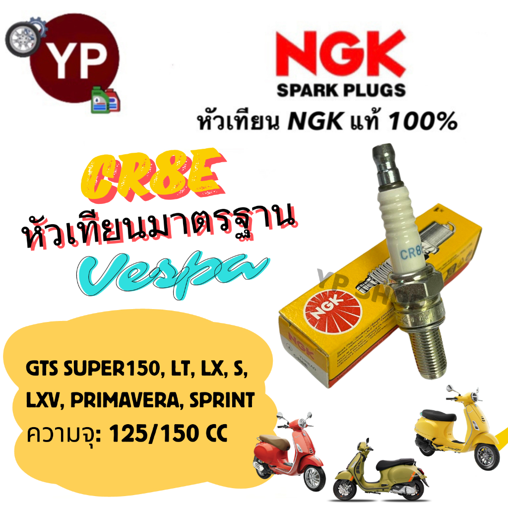 หัวเทียน NGK รุ่น CR8E มาตรฐานเกรดญี่ปุ่นแท้ 100% สำหรับรถ Vespa 125/150 รุ่น S, LX, LT, GTS S150, LXV, Primavera,Sprint