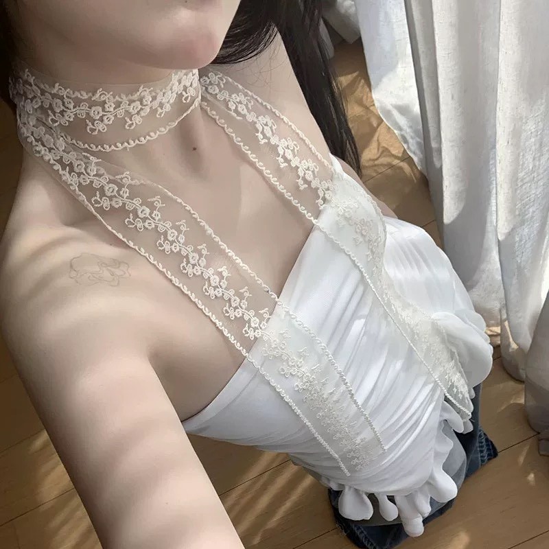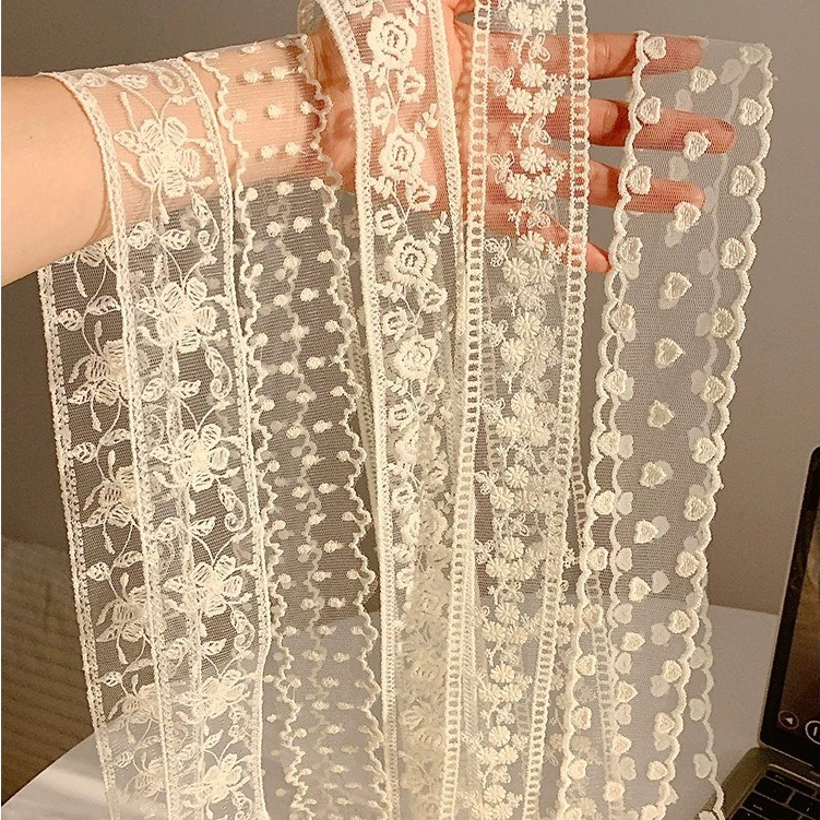 แฟชั่นลูกไม้ ริบบิ้นลูกไม้ ผ้าพันคอ โทนสีครีม ตกแต่งทรงผม