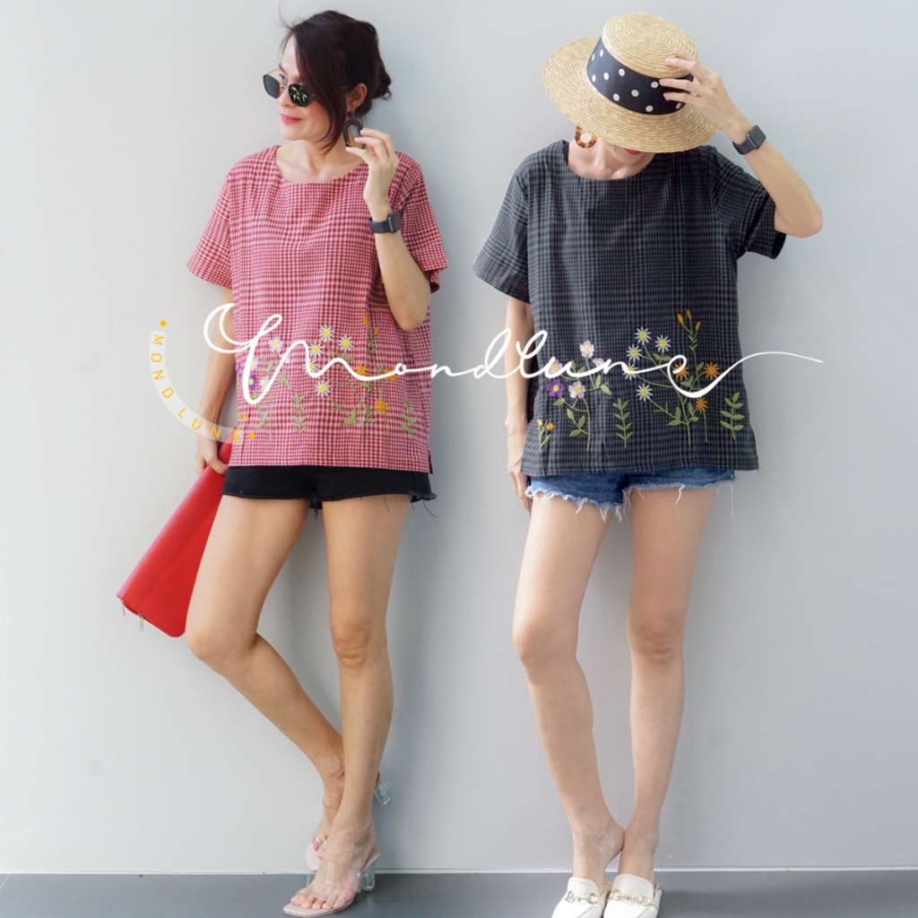 #3211 MondLune เสื้อเบลาส์คอกลม แขนสั้น ลายปักดอกไม้ ผ้าฝ้ายคอตต้อน เนื้อดี ใส่สบาย