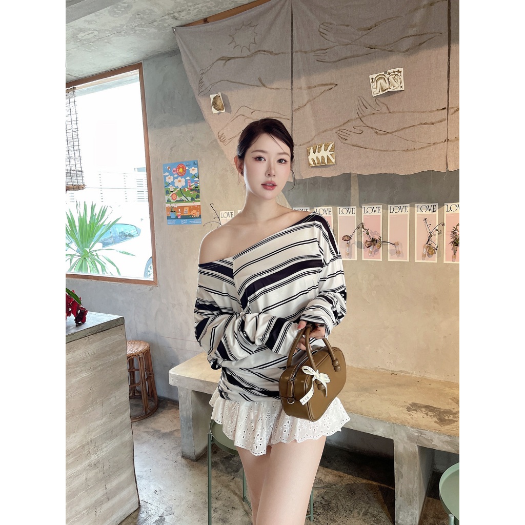 SLYQ SLASH STRIPE TUNIC TOP เสื้อแขนยาวปาดไหล่ลายขวาง ใส่เป็นเดรสได้