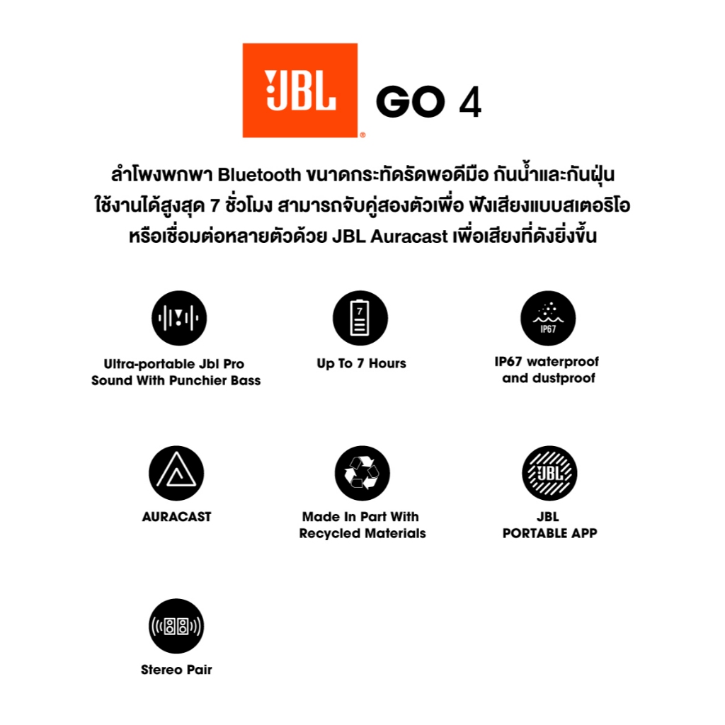 JBL Go 4 ลำโพงบลูทูธแบบพกพาขนาดกระทัดรัด กันน้ำและกันฝุ่น IP67 เล่นเพลงได้นานถึง 7 ชั่วโมง