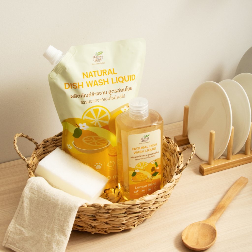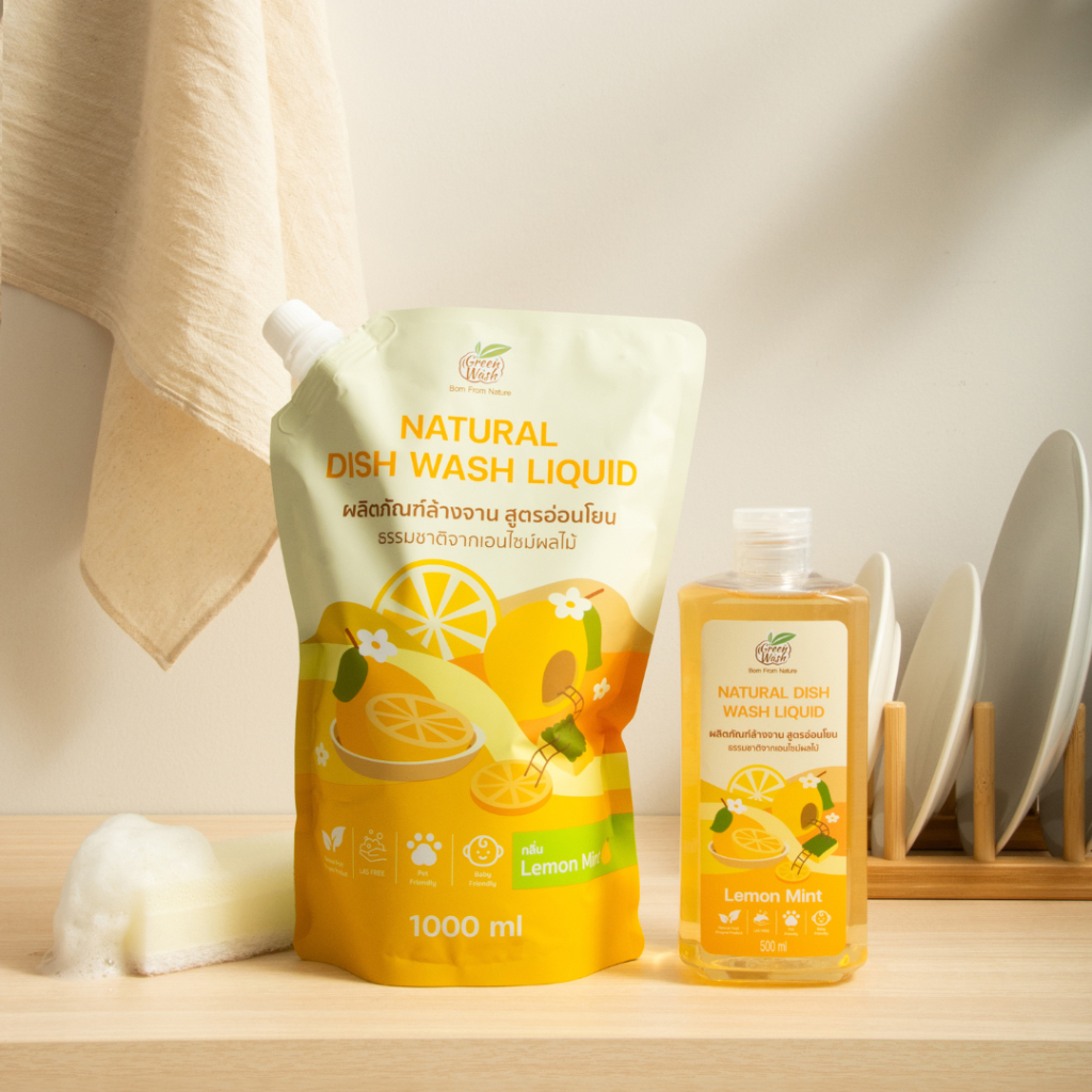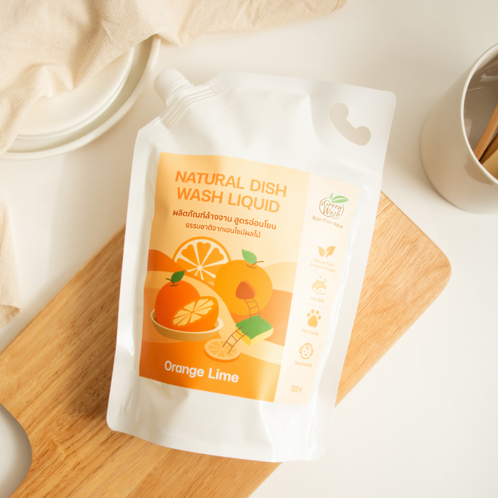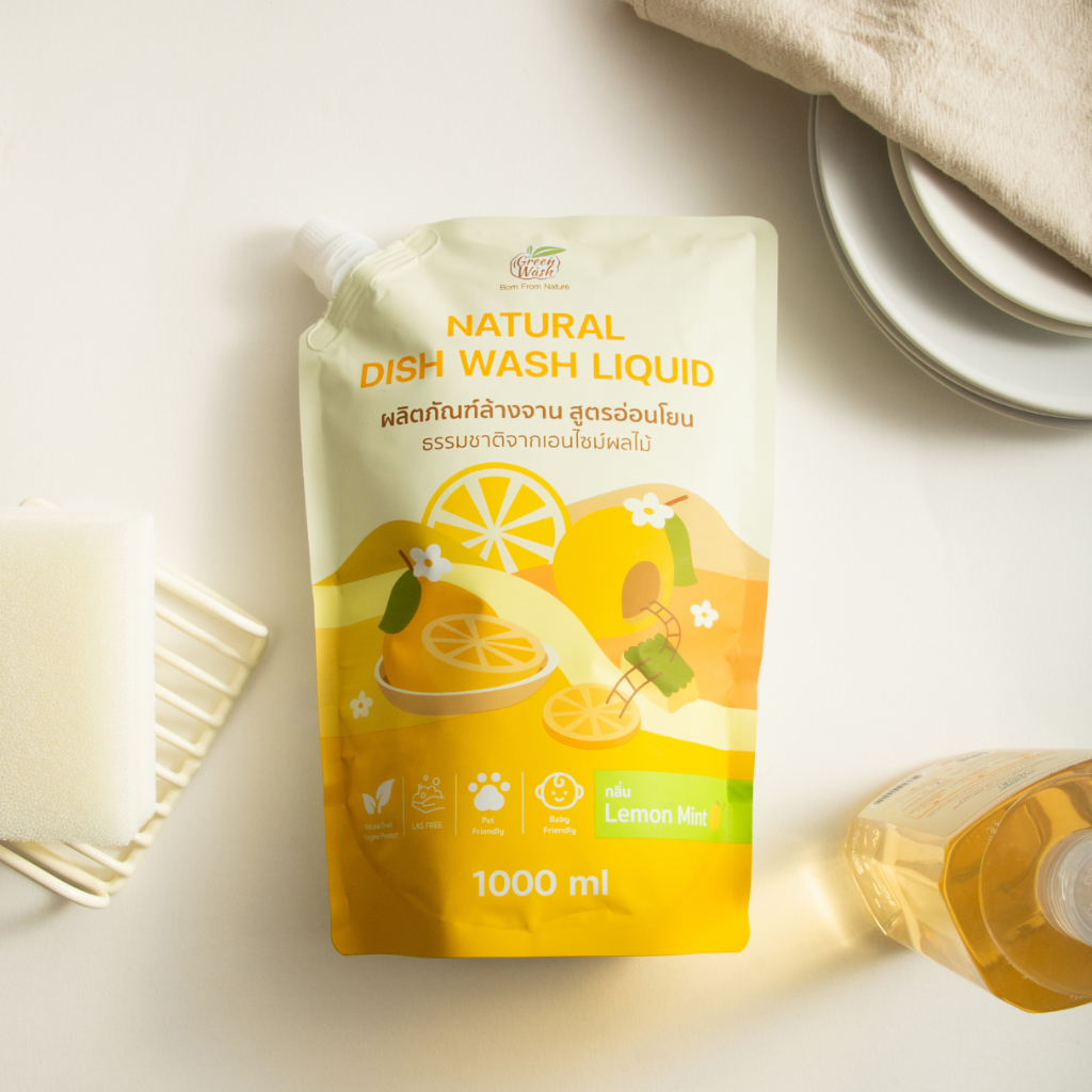 (โปรยกลัง 7ถุง) GreenWash Natural Dish Wash Liquid น้ำยาล้างจานถนอมผิวจากเอนไซม์ผลไม้ธรรมชาติ ถุงรีฟิลล์ 1 ลิตร