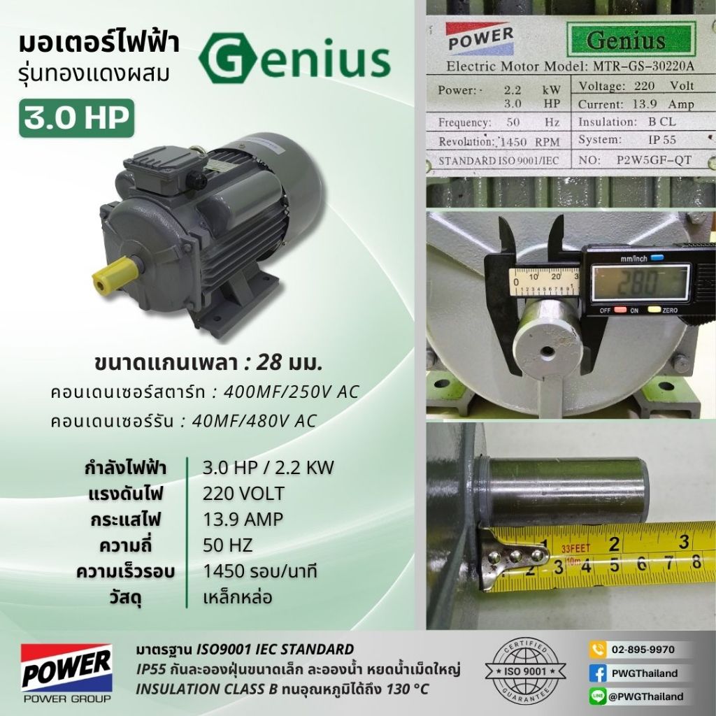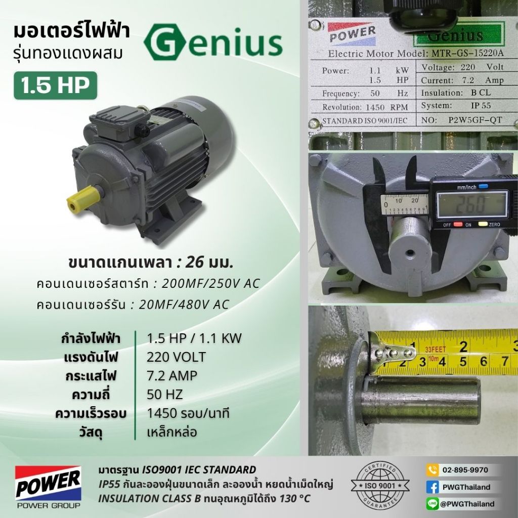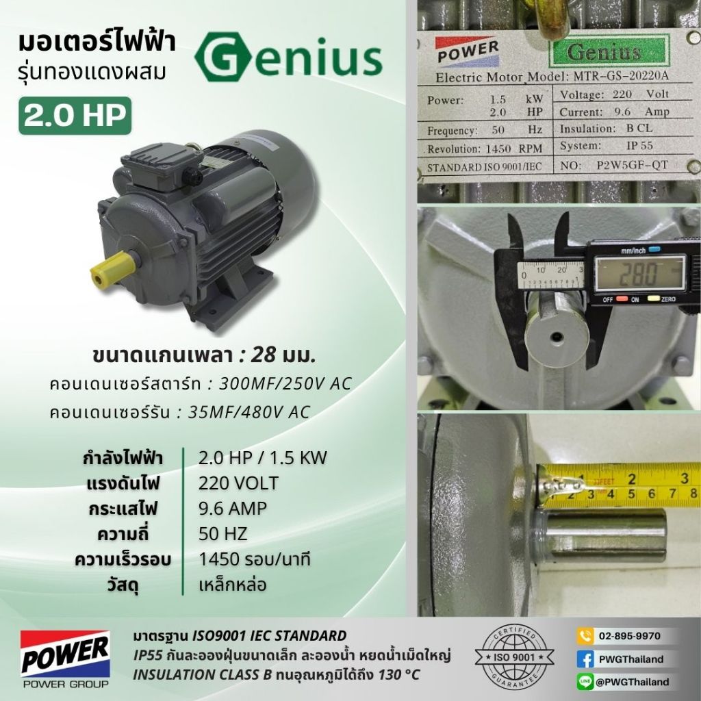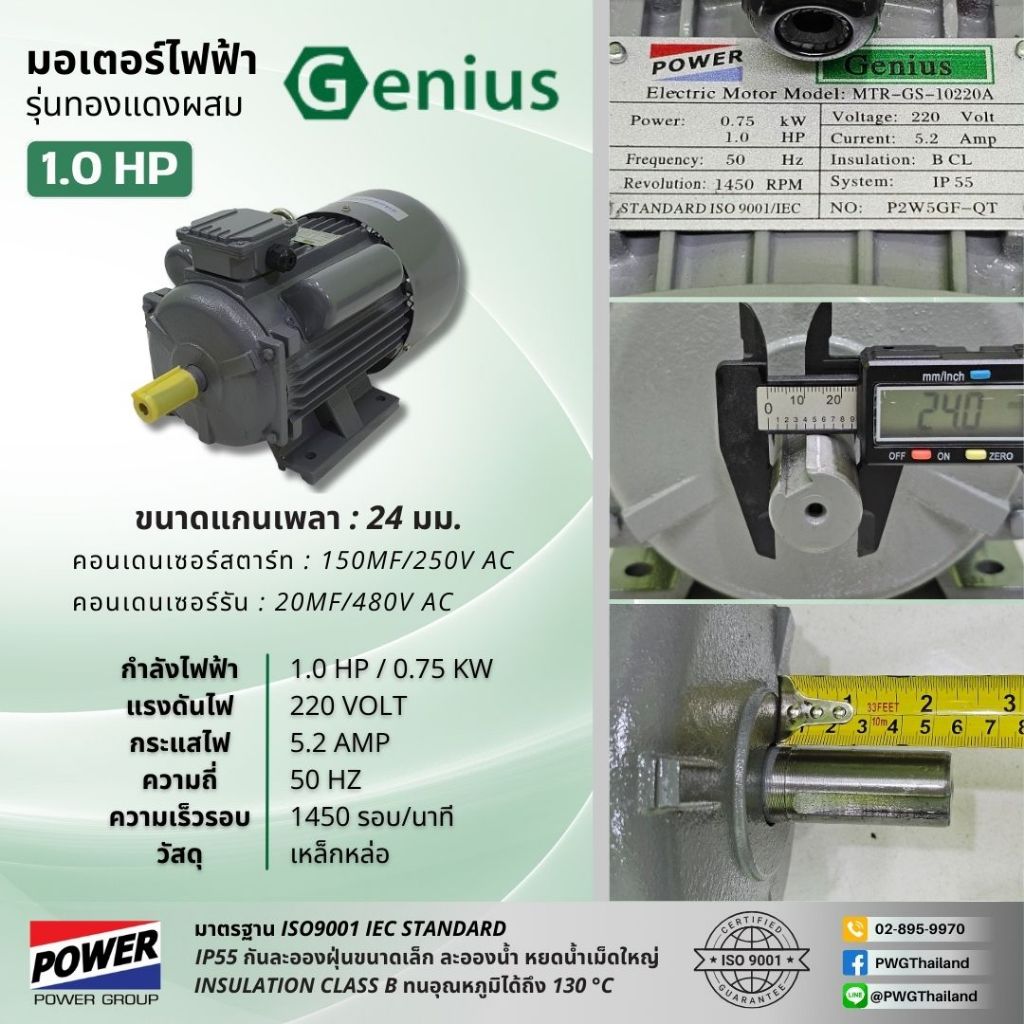 มอเตอร์ไฟฟ้า GENIUS ทองแดงผสม 1.0-5.0 แรงม้า 220V รอบช้า 1450 RPM ไฟกระแสสลับ 1 เฟส 2 สาย