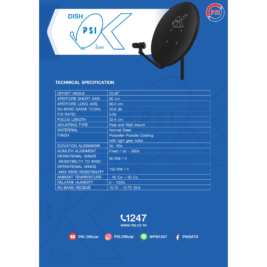 แพ็ค 5 ชุด หน้าจาน PSI OK ขนาด 60 ซม.จานรับสัญญาณจานดาวเทียมระบบ KU BAND