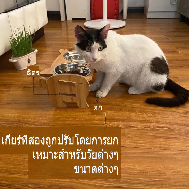 😻พร้อมส่ง😻ชามอาหารสัตว์ ชามเอียง ปรับความสูงได้ ชามสแตนเลส ตัวฐานเป็นไม้ ใส่อาหารหมา แมว