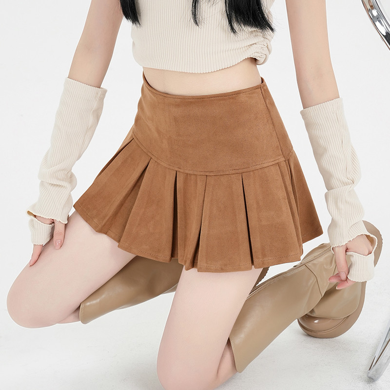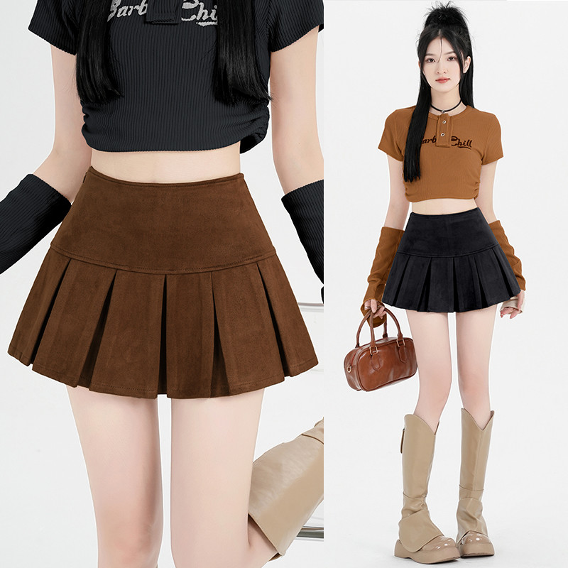 Suxi แฟชั่นฤดูใบไม้ร่วงใหม่สีทึบสบายๆ Retro เอวสูงผู้หญิง A-line กระโปรงสั้นจีบ 240902