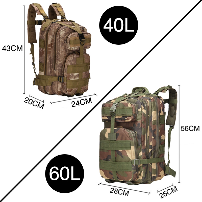 กระเป๋าเป้สะพายหลังความจุขนาดใหญ่พิเศษ กระเป๋าเป้ลายพราง กระเป๋าเป้เดินทางบรรจุ 40L/60L