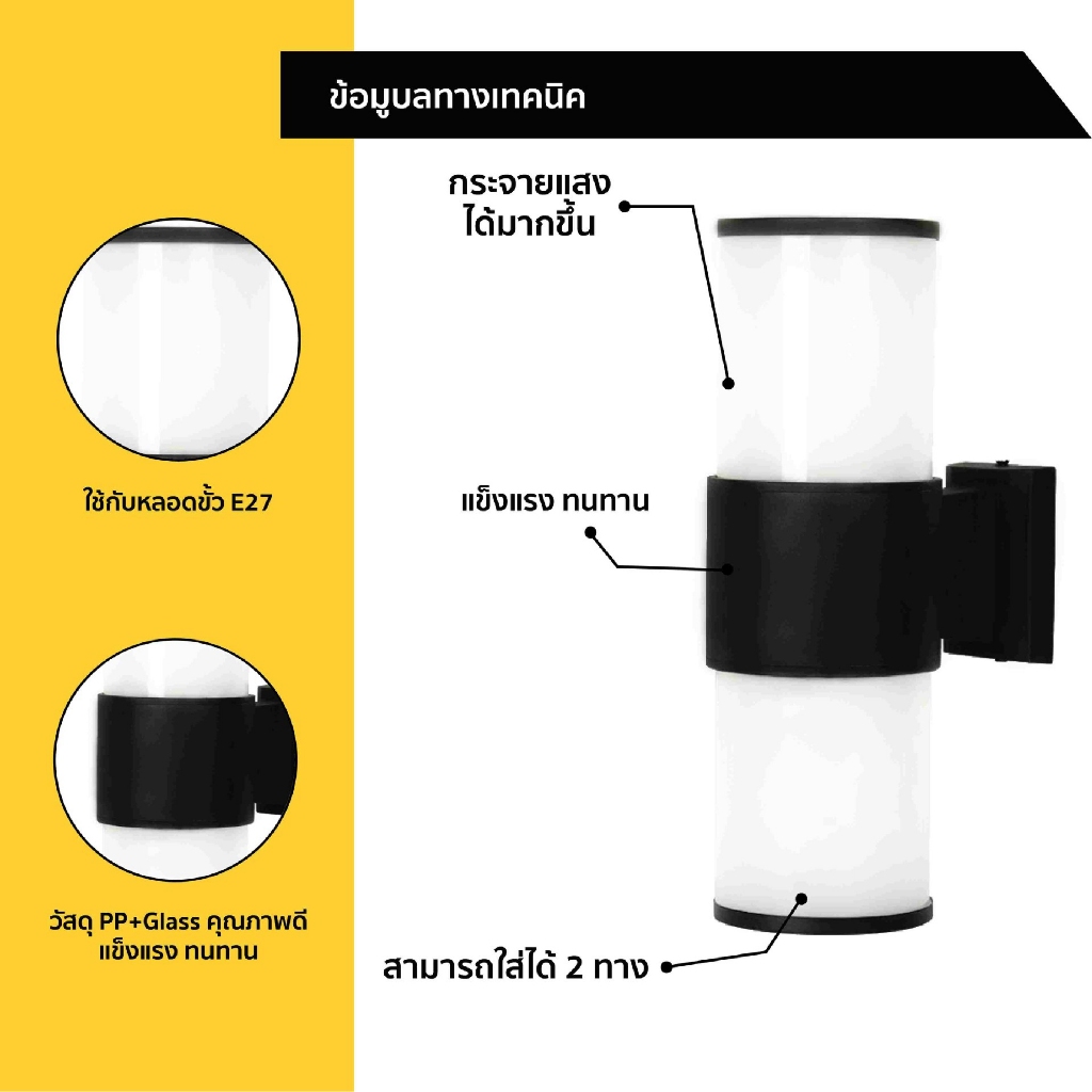 LAMPO โคมติดผนังส่องทางเดียว/ส่องขึ้นลง ขั้วE27 รุ่นPROUD โคมภายนอกสีดำ หน้าขุ่น โคมกลางแจ้ง