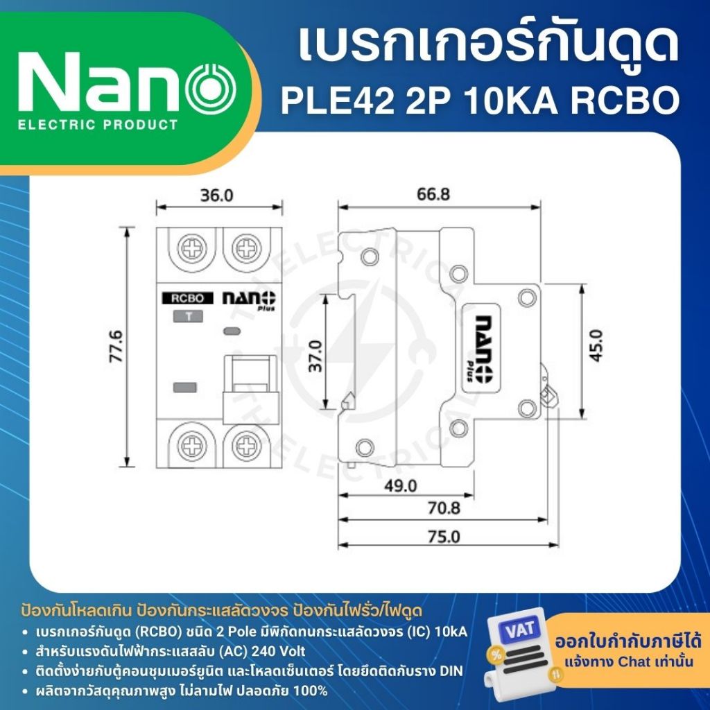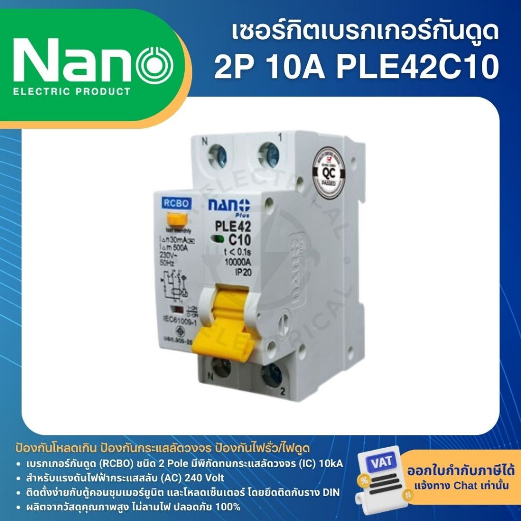 NANO PLE42 เซอร์กิตเบรกเกอร์ กันดูด RCBO 2P 10KA 10A 16A 20A 32A 40A 50A 63A เมนกันดูด แบบเกาะราง