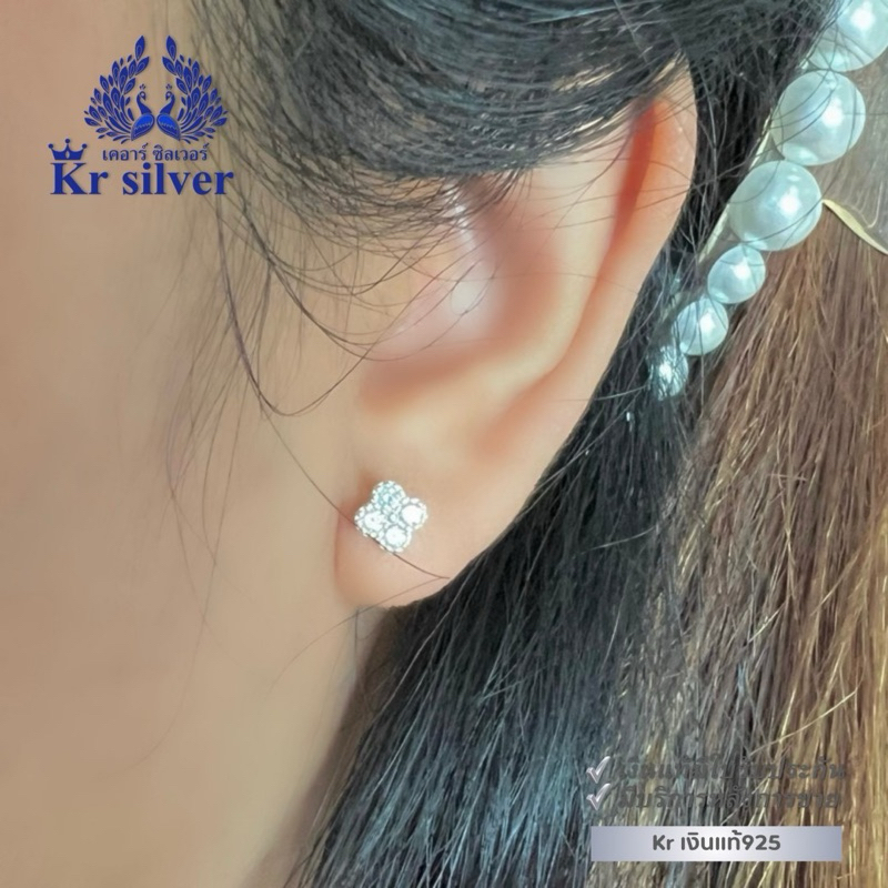 Kr silver เงินแท้มีใบรับประกัน ต่างหูเงินแท้ ใบโคลเวอร์ เคลือบทองคำขาว / ต่างหูเงินแบบเสียบทับ | SE14