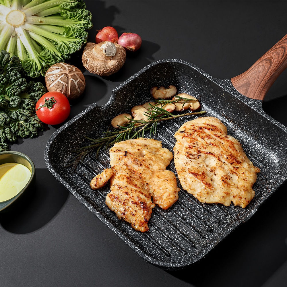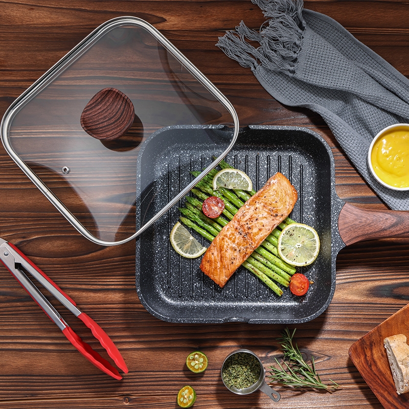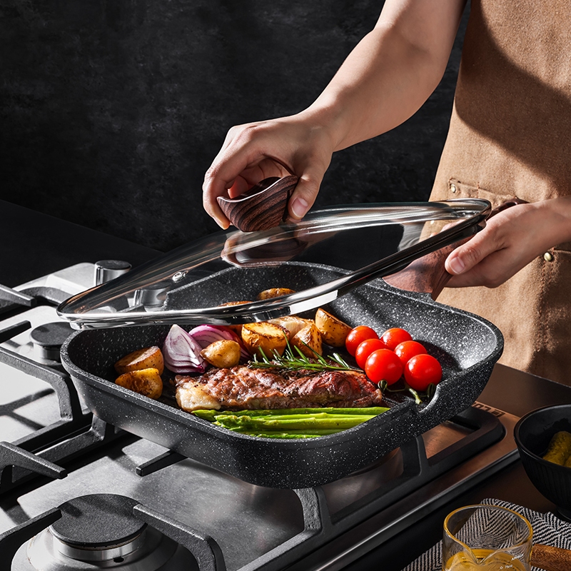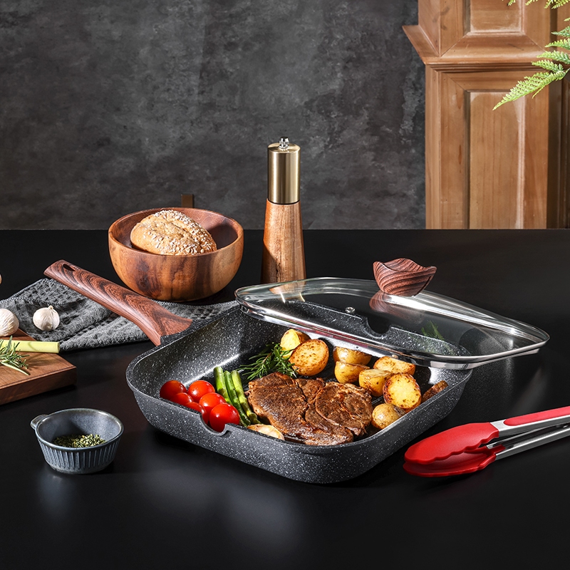 KORDISEN กระทะเคลือบหินอ่อน กระทะไข่ม้วน กระทะหินทรงสี่เหลี่ยมขนาดเล็ก พร้อมฝาและที่คีบ ให้ความร้อนสม่ำเสมอ PFOA ฟรีสามารถใช้กับเตาแม่เหล็กไฟฟ้า
