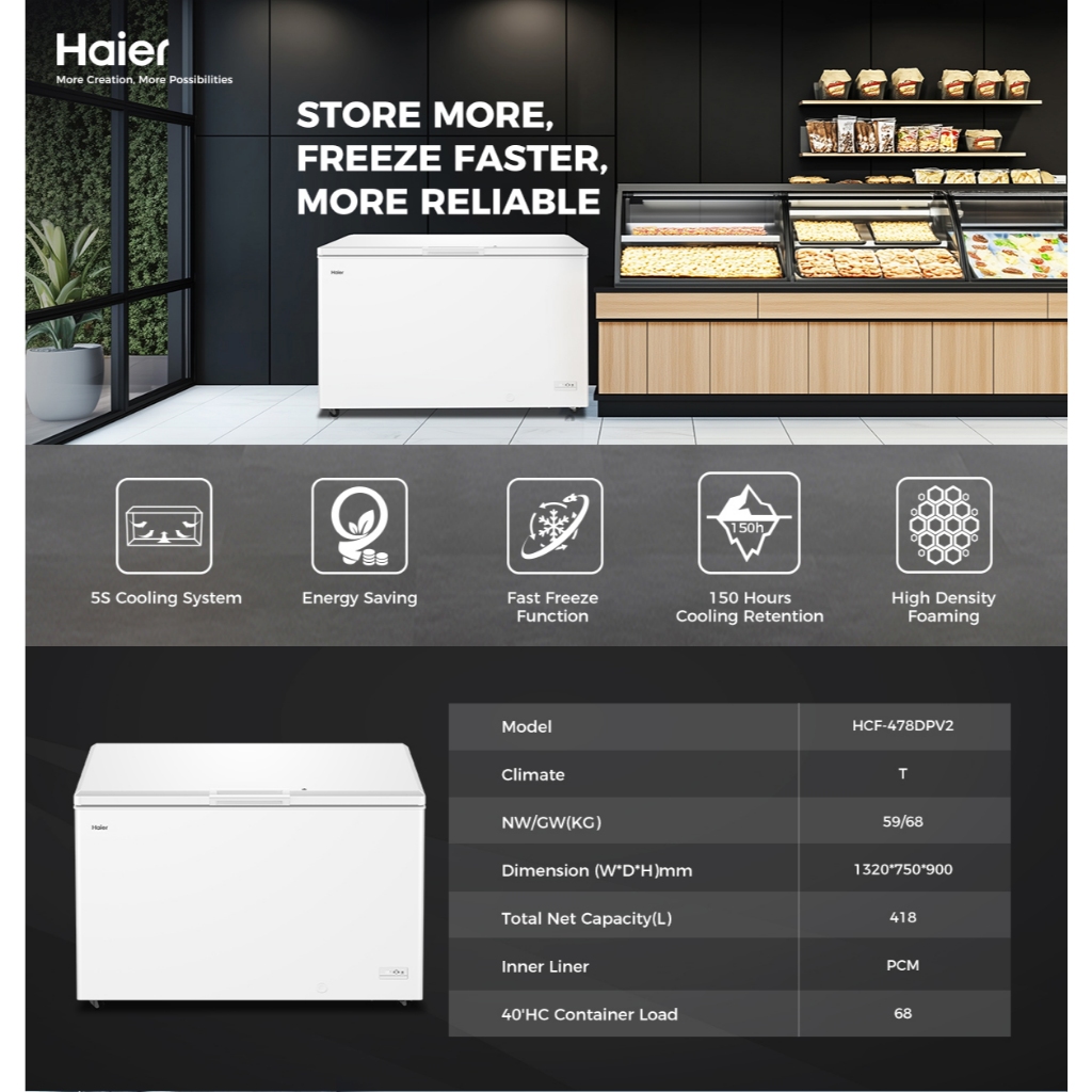 Haierตู้แช่แข็ง ทำความเย็น10องศาถึง-30องศาขนาด 14.8Q / 418L รุ่น HCF-478DPV2