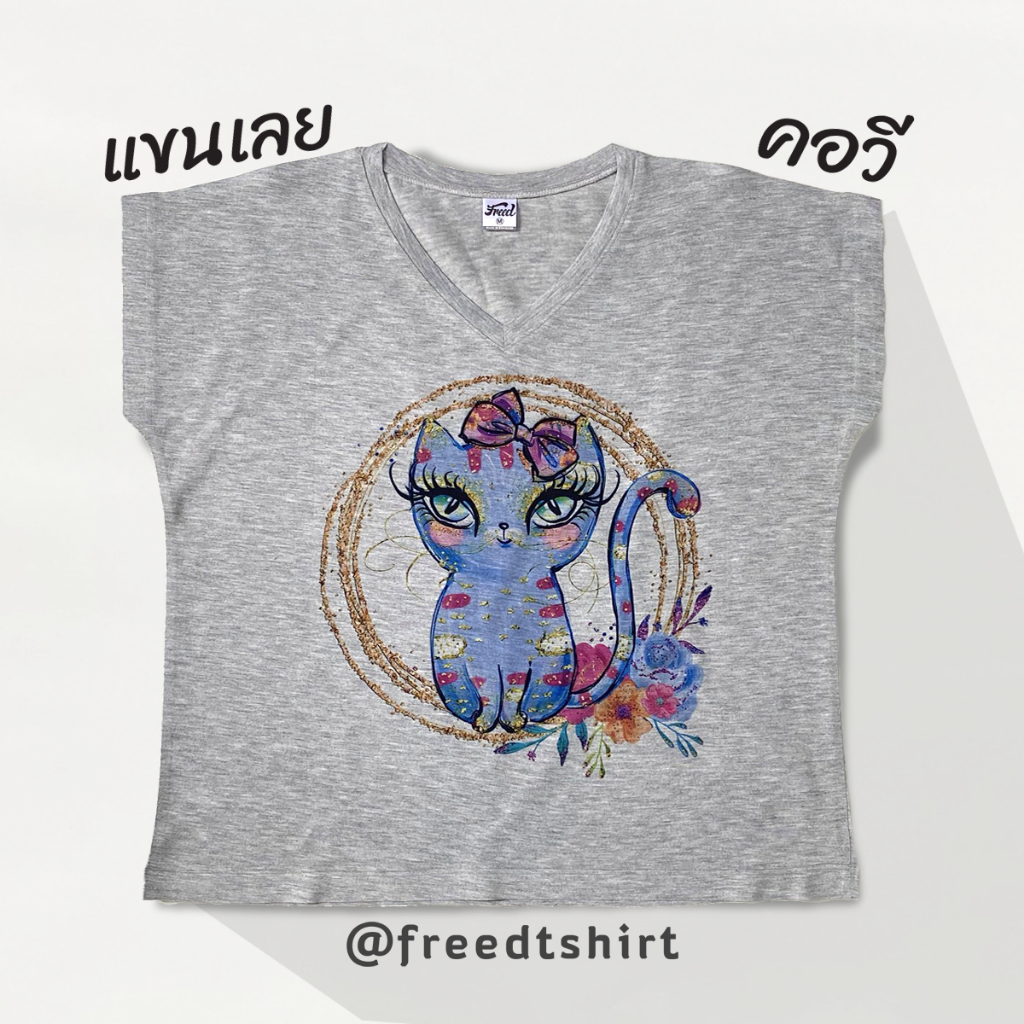 FREED คอวี เสื้อแขนเลยสีเทา ผ้าTktopdye พิมพ์ลายน่ารัก