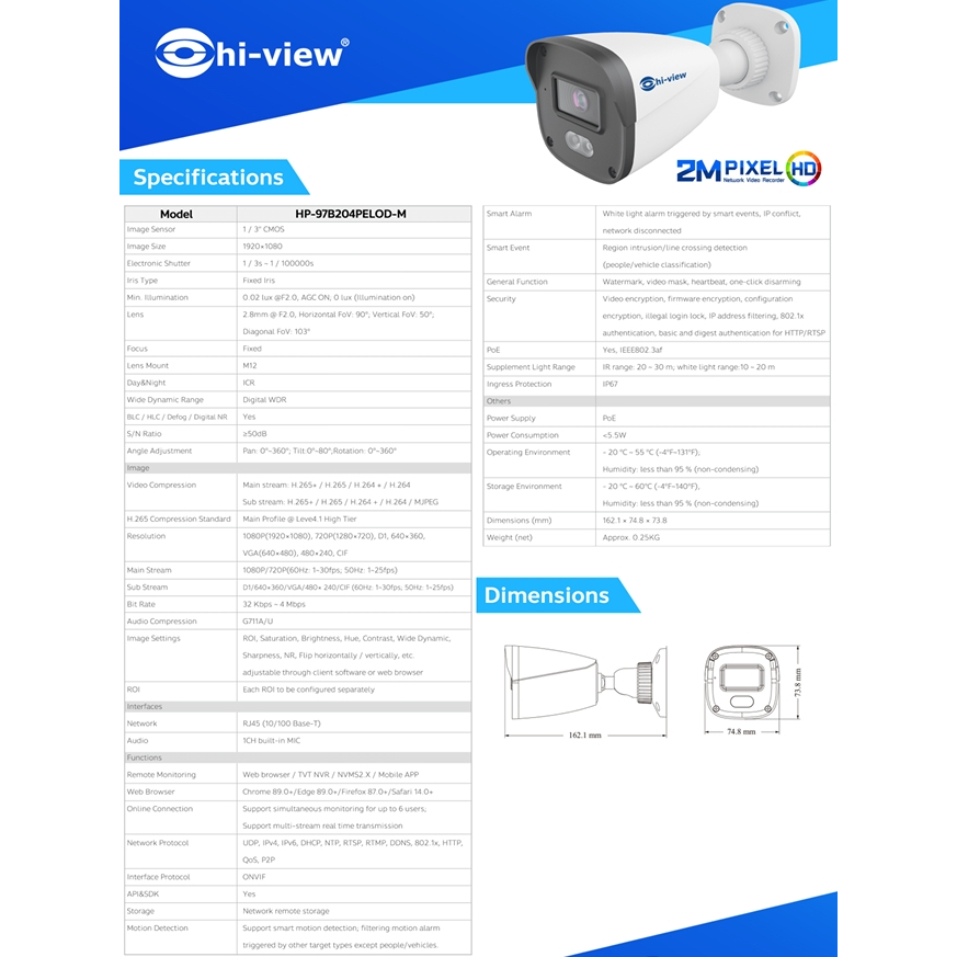 Hi-view Bullet Camera 9700 Series 2MP. รุ่น HP-97B204PELOD-M สี 24 ชม. มีไมค์ชัดเว่อร์!!!!